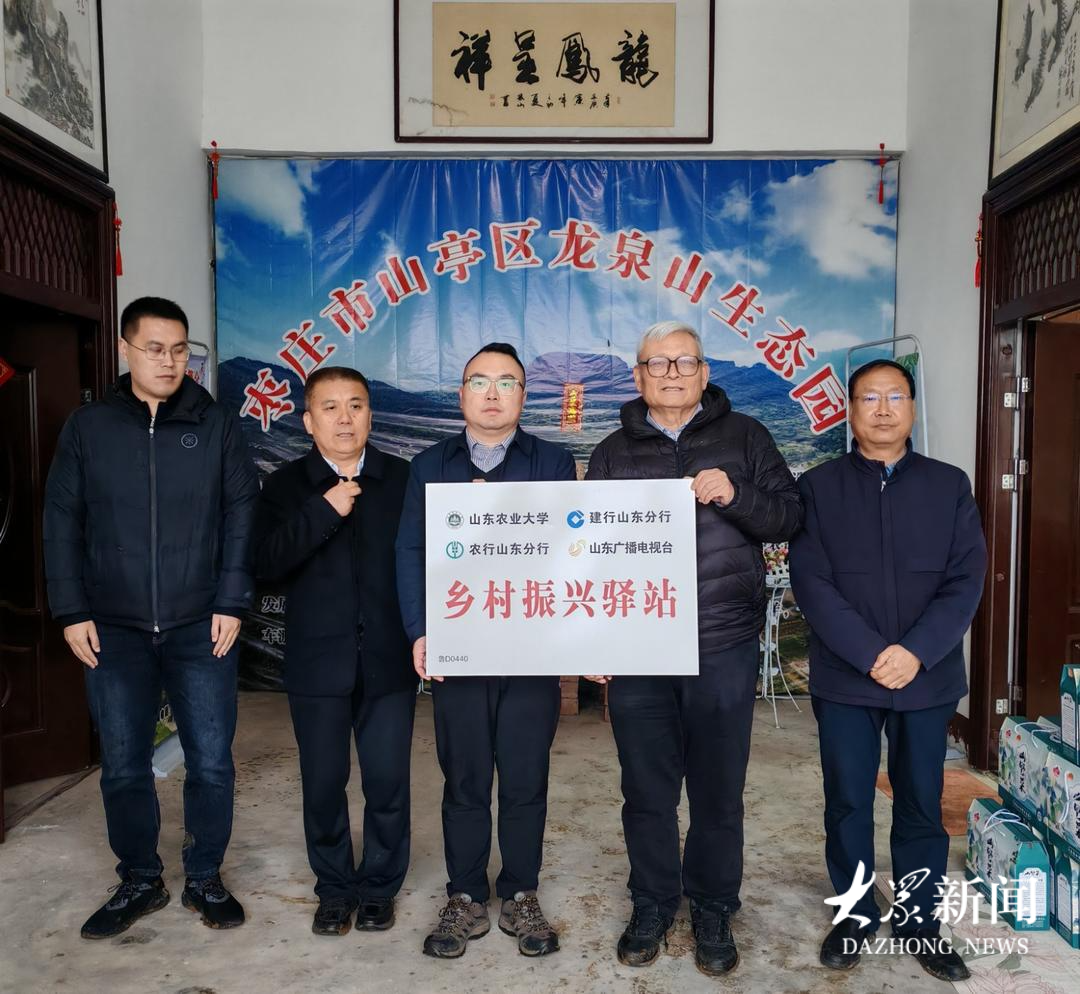 帮扶团队为山亭区龙泉山庄家庭农场“头雁”带头人宋允超授“乡村振兴驿站”牌。