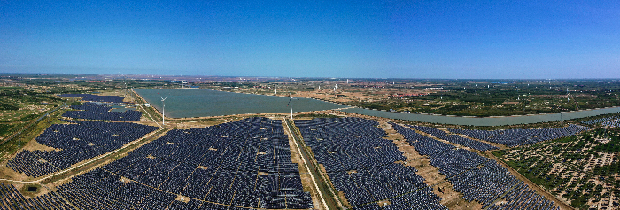 过去,人们望“碱”兴叹;如今,这里成片的光伏板如蓝色海洋,与远处旋转的风机组成一幅现代能源画卷,成为滨州能源革命的主战场。