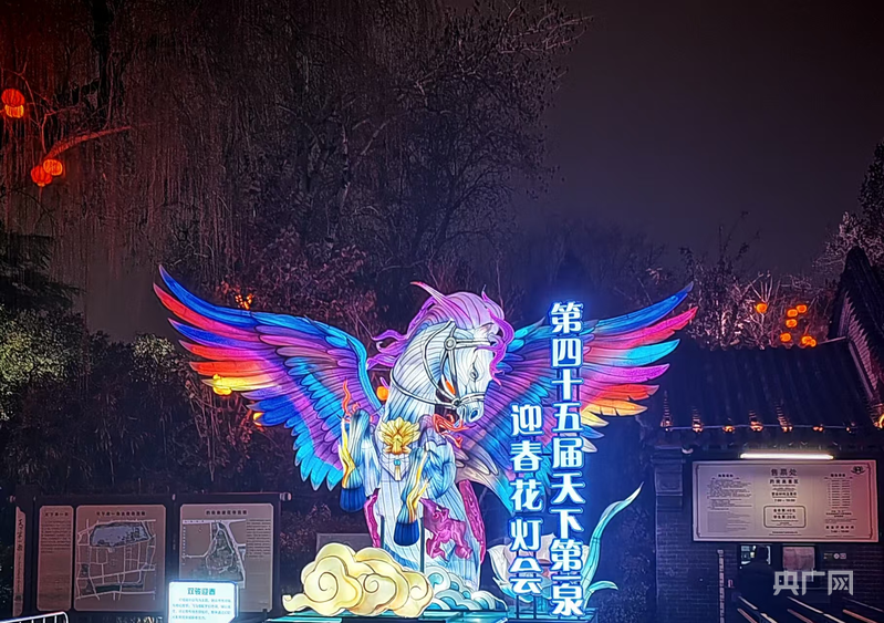 趵突泉景区东门的“飞马”造型花灯,马踏祥云,迎春送福