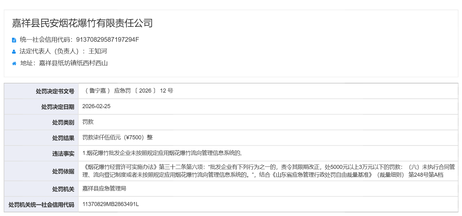 近日,从山东省应急管理厅网站了解到,嘉祥县纸坊镇的嘉祥县民安烟花爆竹有限责任公司,因烟花爆竹批发企业未按照规定应用烟花爆竹流向管理信息系统的违法事实,依据《烟花爆竹经营许可实施办法》第三十二条第六项:“批发企业有下列行为之一的,责令其限期改正,处5000元以上3万元以下的罚款:(六)未执行合同管理、流向登记制度或者未按照规定应用烟花爆竹流向管理信息系统的。”结合《山东省应急管理行政处罚自由裁量基准》(裁量细则)第248号第A档,被嘉祥县应急管理局罚款7500元。
