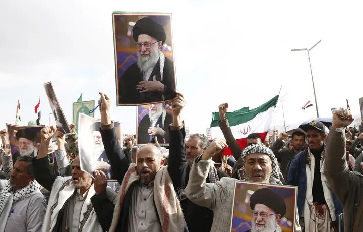 2026年3月1日,在也门首都萨那,人们集会声援伊朗。美国和以色列2月28日对伊朗发动军事打击,伊朗最高领袖哈梅内伊遇害。新华社发