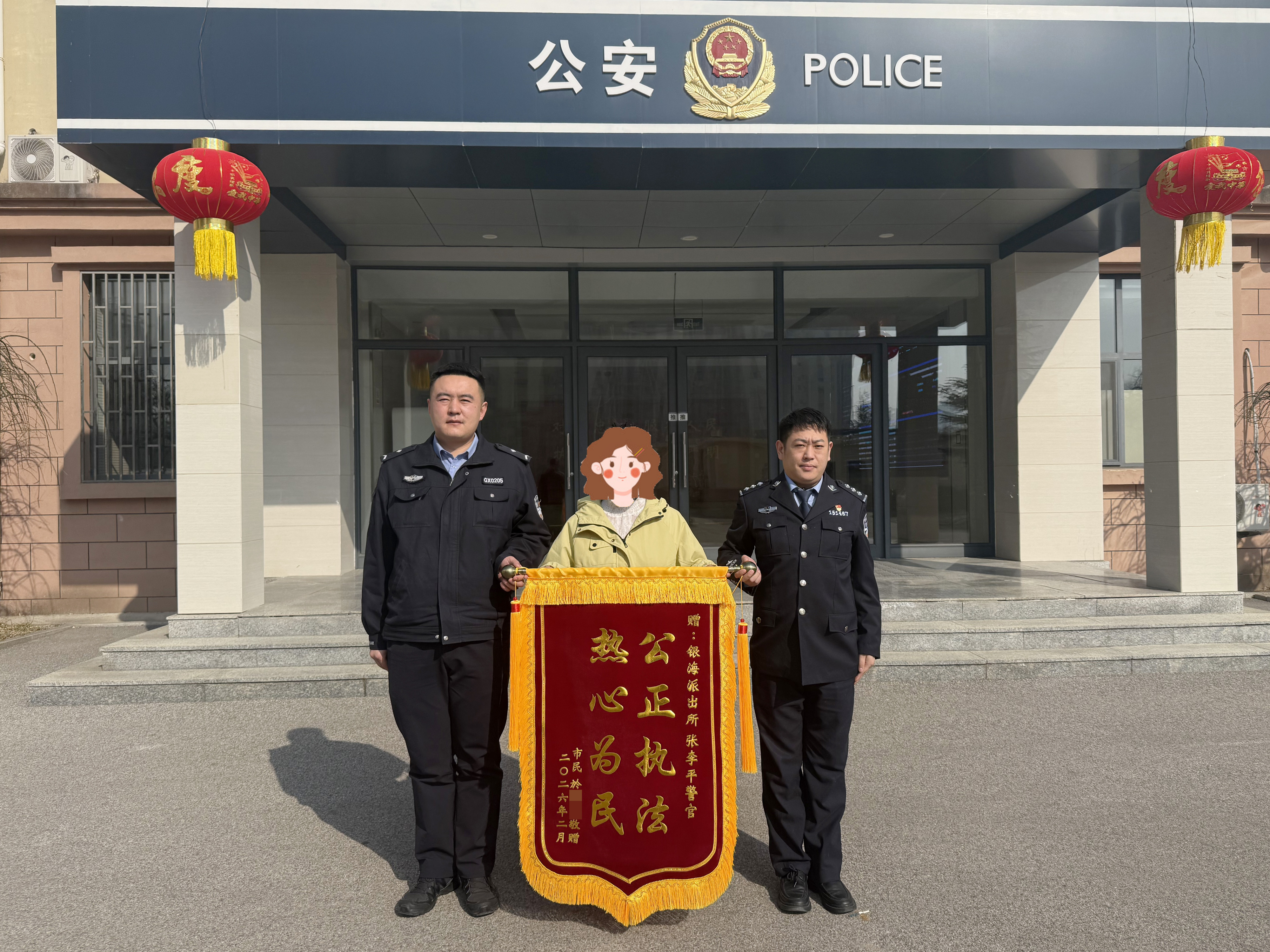 2月24日,辖区居民於女士将一面印有“公正执法 热心为民”的锦旗送到银海派出所民警张李平手中,对其高效履职、热心为民的工作作风表示衷心感谢。此前於女士因个人财物遗失向银海派出所求助。民警张李平接警后,通过多方排查走访,仅用数小时便成功找回了遗失财物,避免了经济损失,得到了群众的充分认可。
