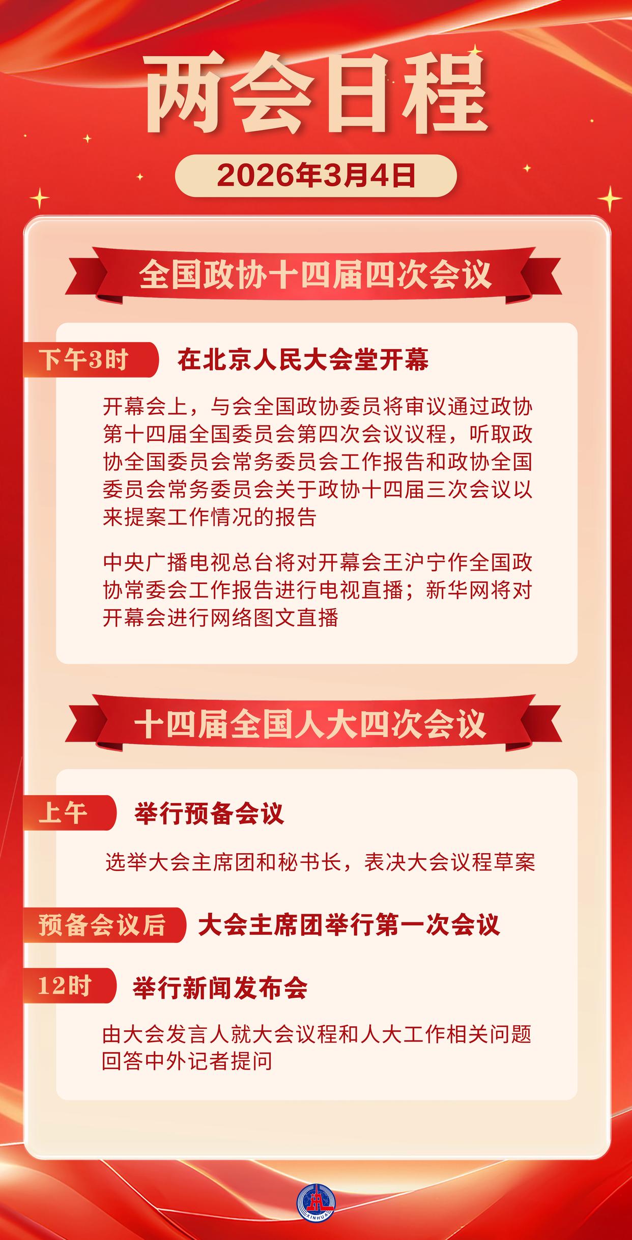 两会日程预告|3月4日:全国政协十四届四次会议下午3时开幕 十四届全国人大四次会议举行预备会议新华社 2026-03-03 22:05:153月4日,全国政协十四届四次会议下午3时开幕。十四届全国人大四次会议举行预备会议。(新华社)责任编辑:朱洪蕾
