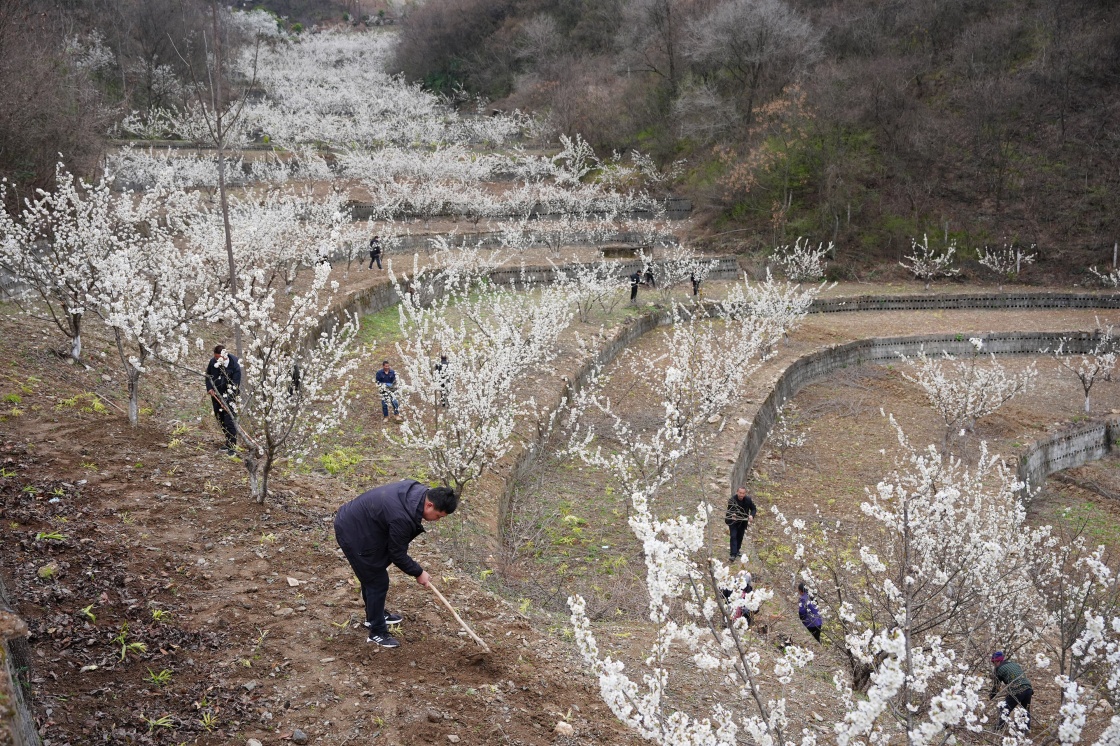 3月3日,在旬阳市段家河镇薛家湾社区樱桃园内,镇村干部和村民一起开展园区春管工作。新华社