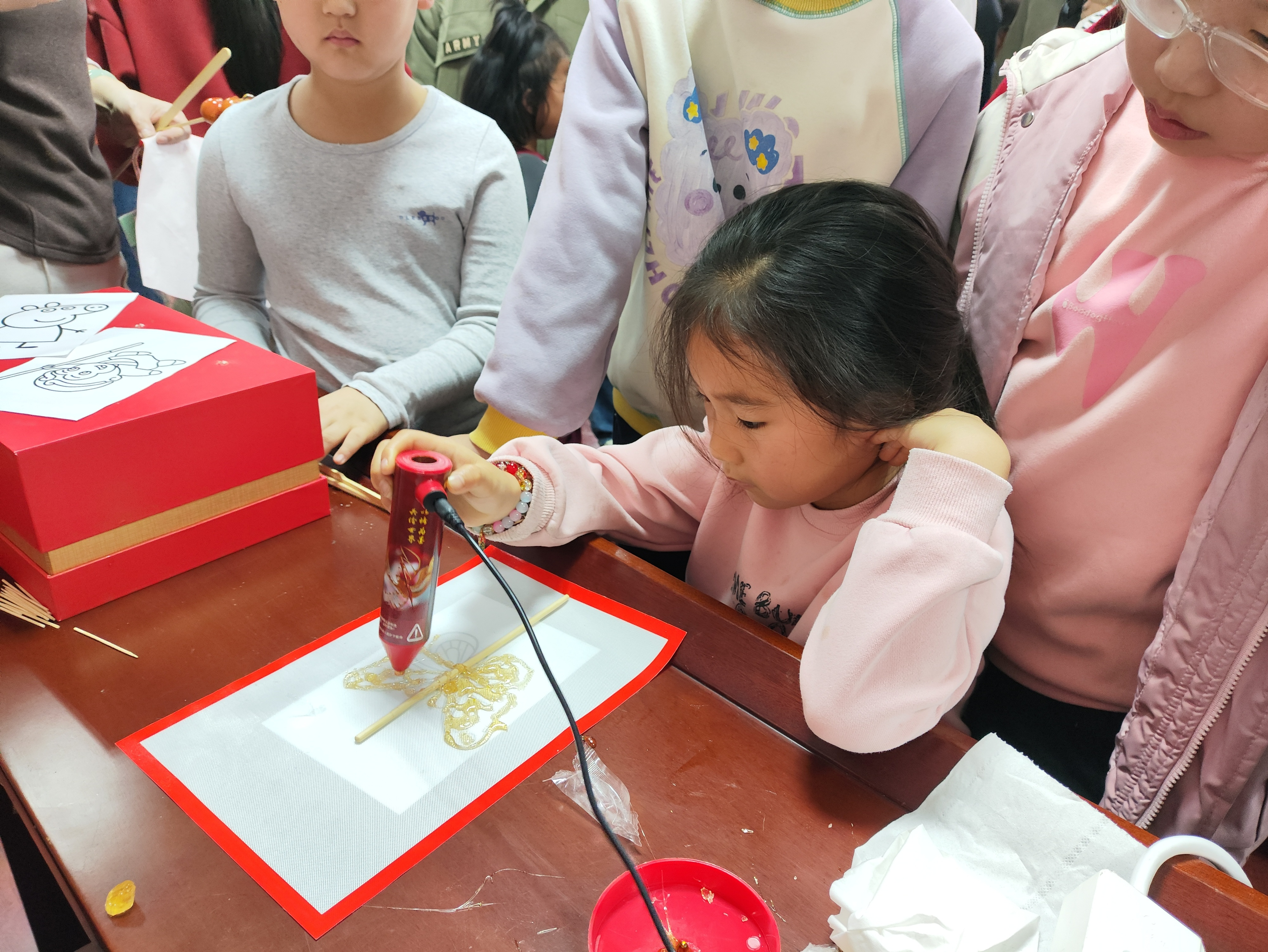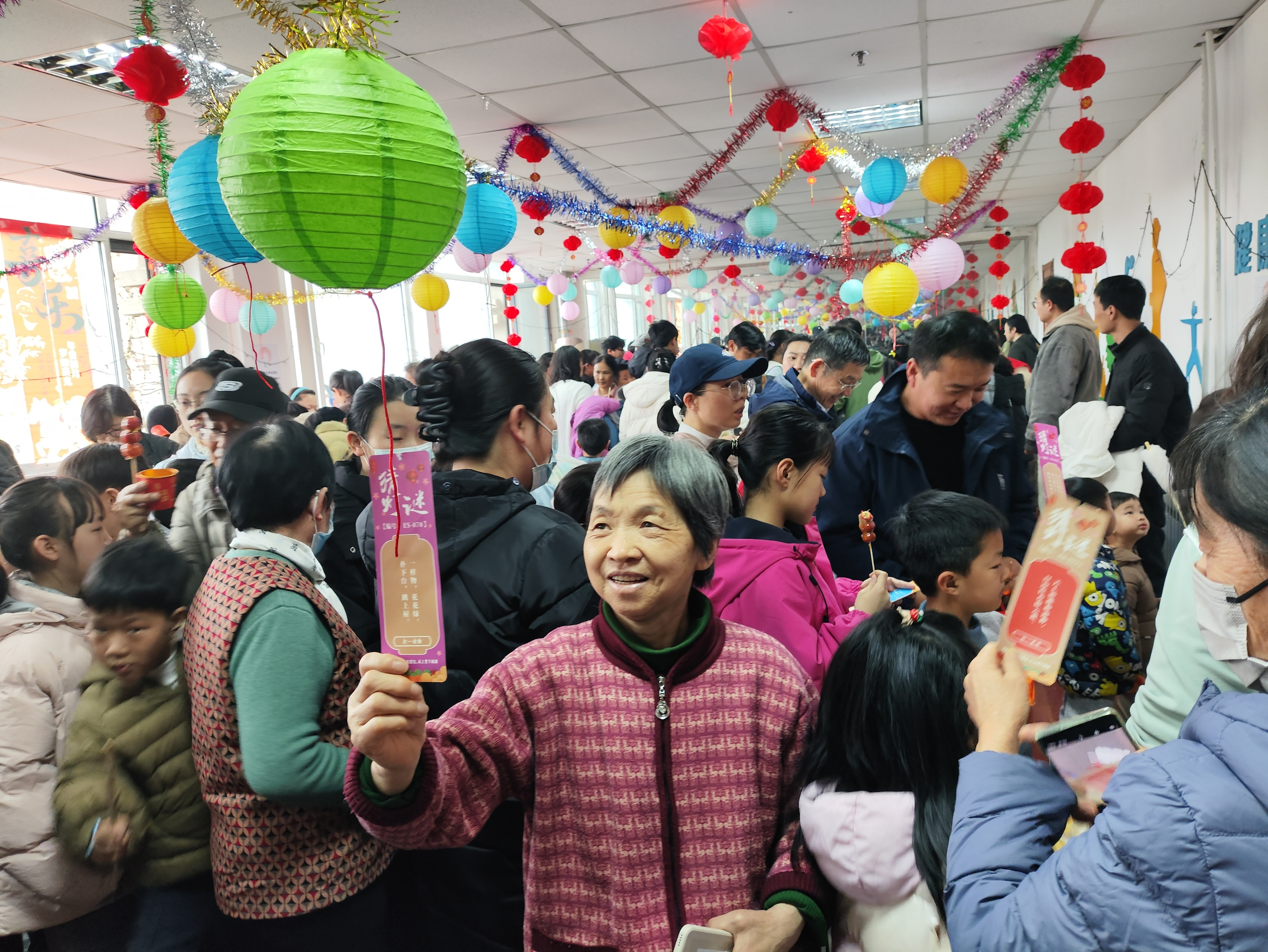除公益市集外,本次游园会还设置了猜灯谜、非遗体验、“舌尖年味”、游戏闯关环节。灯谜区一条条五彩谜语悬挂在彩灯之上,居民兴致勃勃地挑战自己的智慧和才情。非遗体验板块,设置了拓画、糖画、剪纸、灯笼制作等摊位,家长和小朋友们雀跃而上,给节日增添了浓厚的色彩。