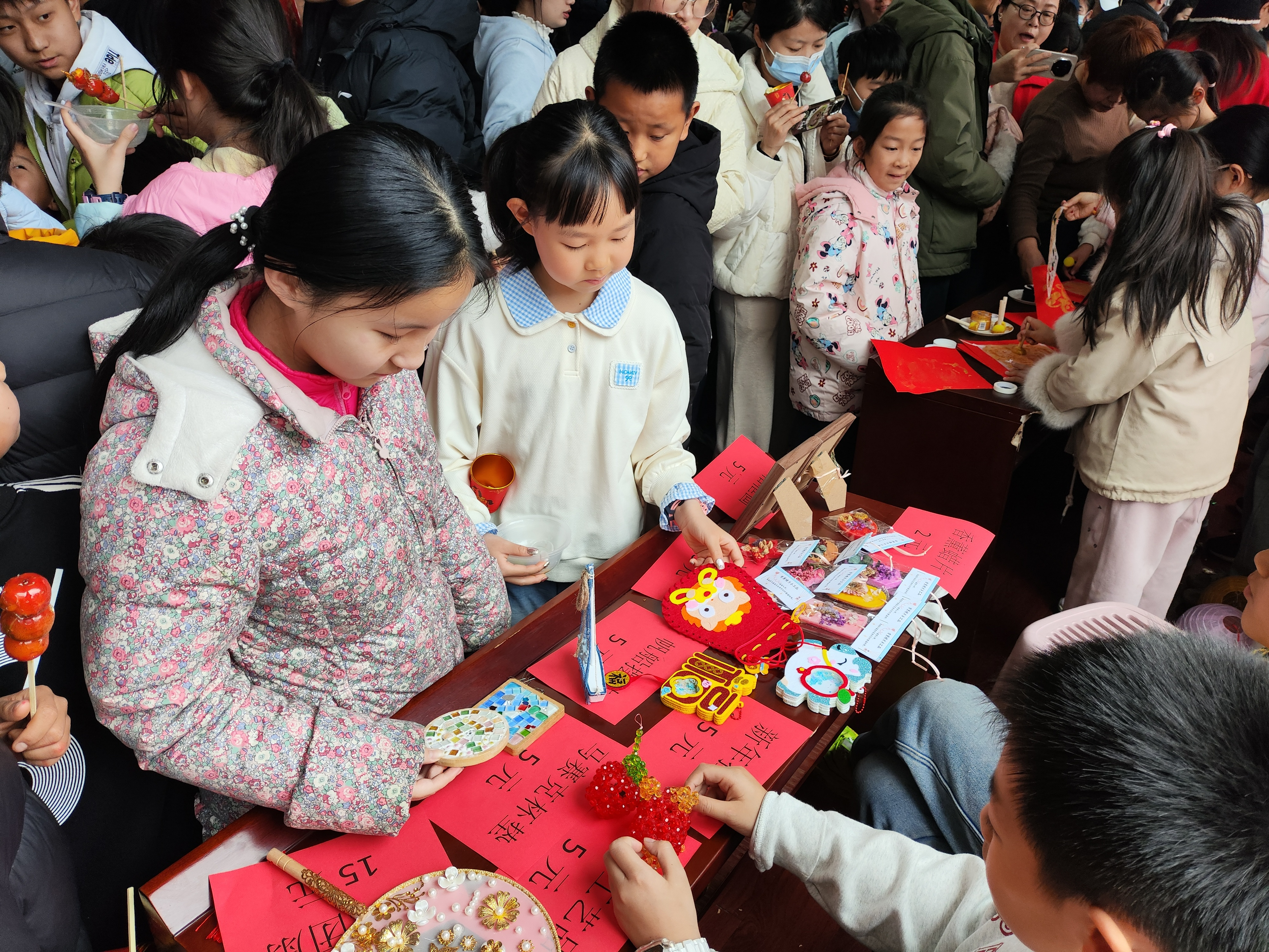 活动现场,一片充满童真与暖意的公益市集区域格外引人注目。小志愿者们小心翼翼地将前期困境儿童精心制作的手工黏土画、新年挂饰、创意摆件等物品一一陈列在摊位上,并贴心地为每件物品配上精美的价格标签。前来游园的亲子家庭被这抹童真暖意深深吸引,纷纷驻足挑选自己喜欢的物品。