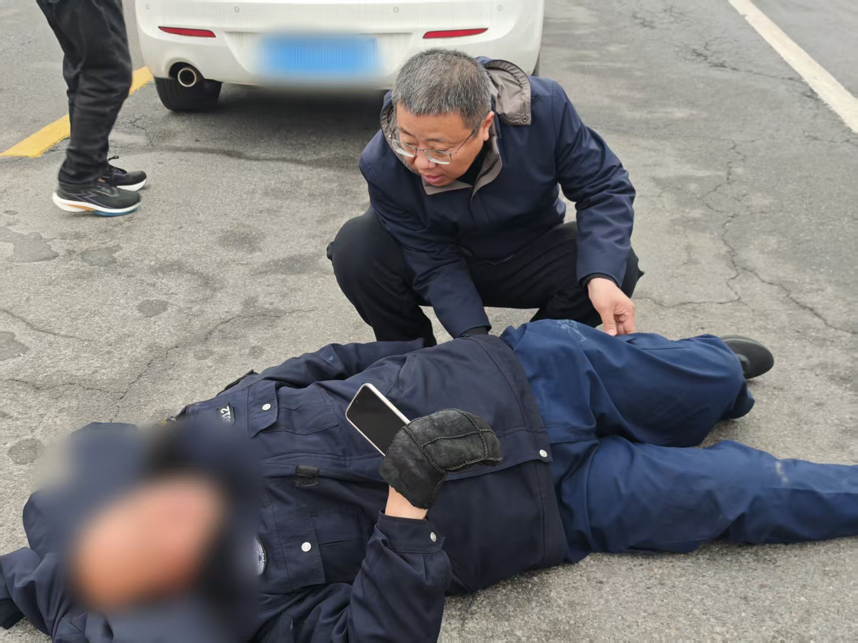桓台县起凤镇中心卫生院院长巩向禄正在上班路上,恰好路过,看到有人倒地,他立马停车救人。