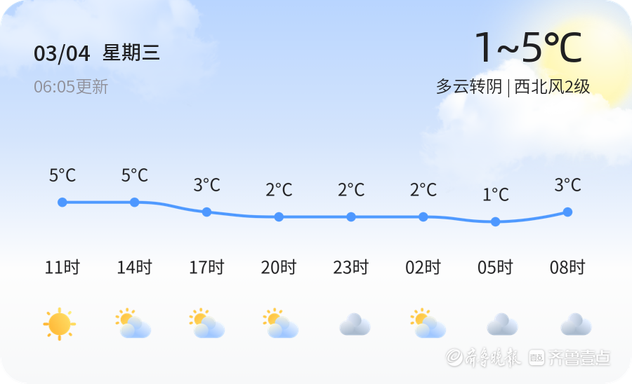 今天是3月4日,星期三,农历正月十六。威海市今天天气多云转阴,气温在1℃到5℃之间,西北风2级,空气湿度85%。PM2.5指数为148,空气质量为中度污染,建议市民减少户外活动,敏感人群应佩戴口罩。出行时请注意保暖,防范降温对身体的影响。