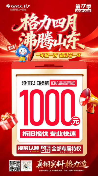 四月齐鲁,沸腾依旧。2026年,备受瞩目的“格力四月沸腾山东”迎来第17季盛典。自2009年启动以来,这一山东家电行业标志性促销IP,今年以“不用等到4月,3月全面启动”的抢先姿态震撼回归,以“一年仅一次,错过等一年”的让利力度,为消费者带来重磅福利与品质家电选择。