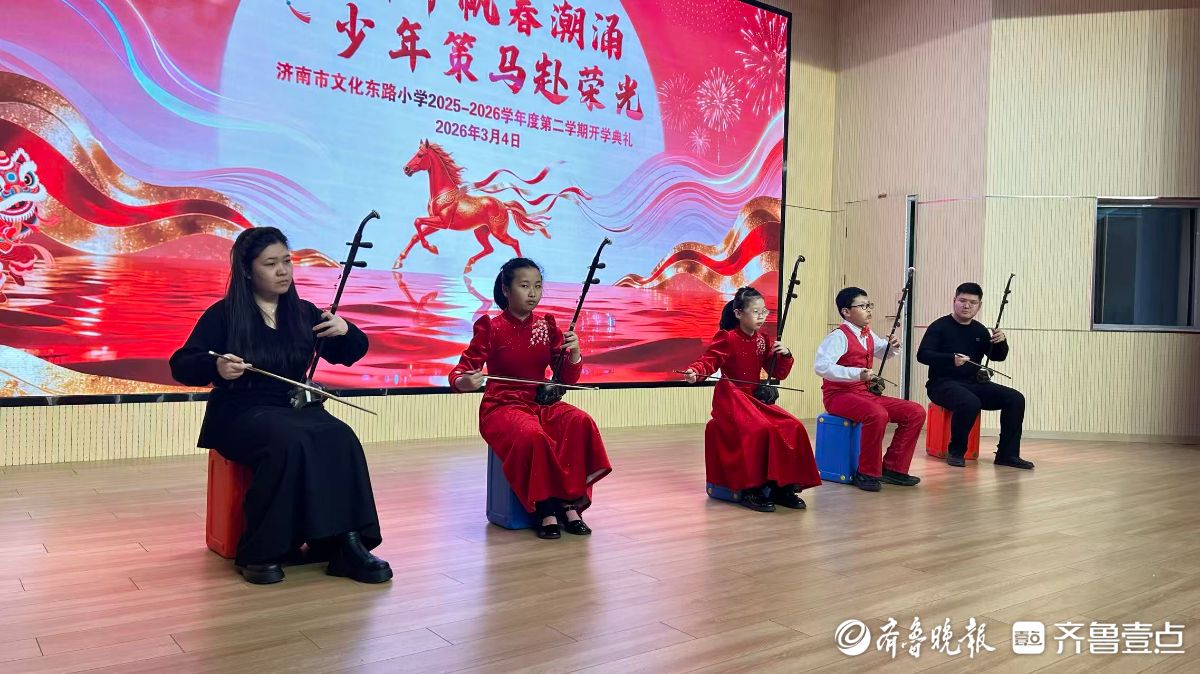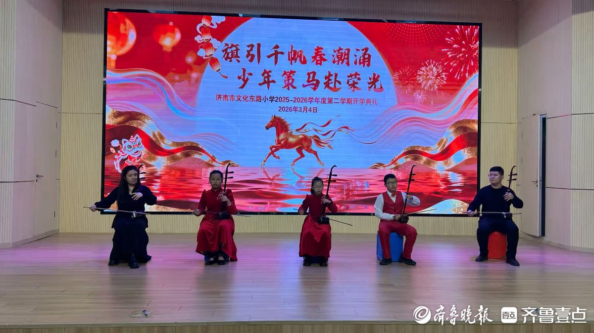 3月4日,济南市文化东路小学开学典礼在激昂奔放的二胡曲《赛马》中拉开帷幕。