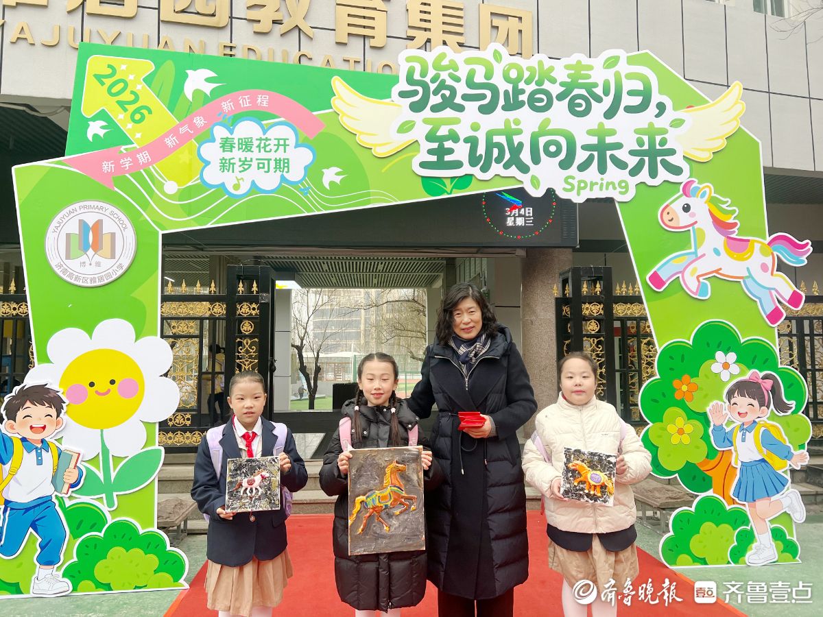 济南高新区雅居园小学举行 “骏马踏春归 至诚向未来” 主题开学报到活动。活动当天,学生可通过身着马元素服饰、背诵马相关诗词、送上马年吉祥祝福三选一形式参与。