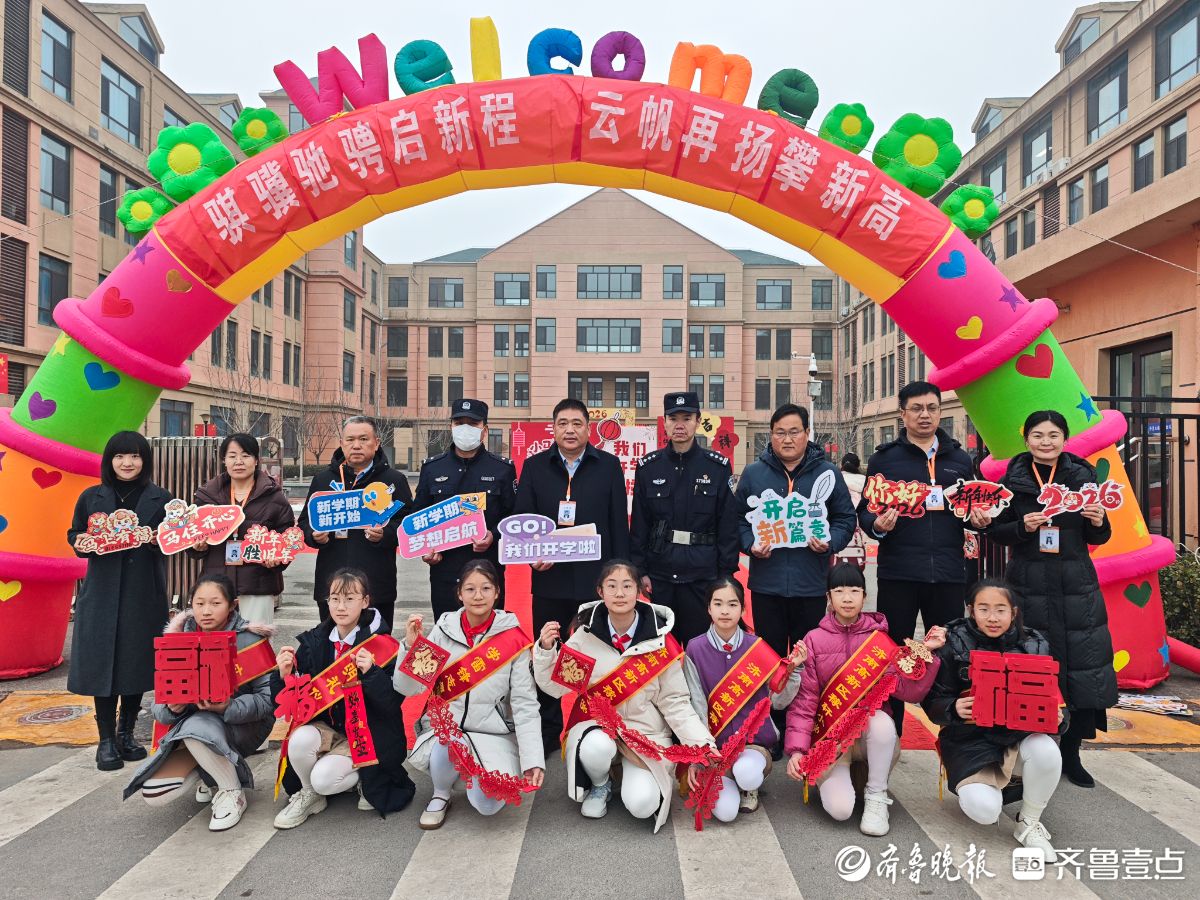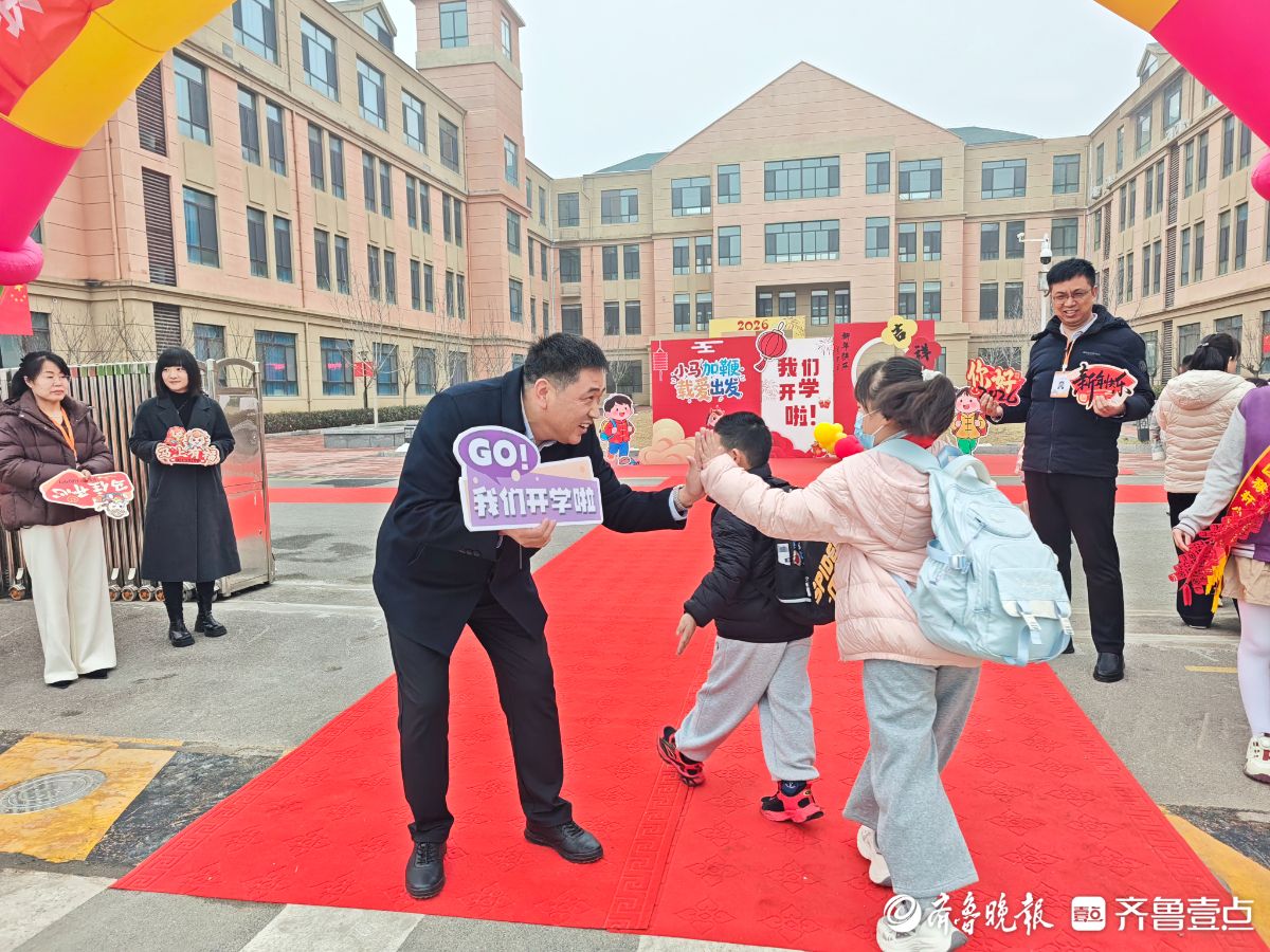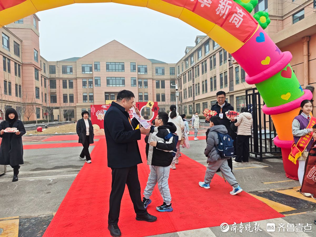 3月4日清晨,济南高新区稼轩小学“骐骥驰骋启新程,云帆再扬攀新高”主题开学典礼温馨启幕。校门口,校领导、教师与家长志愿者一同值守,手持迎新道具迎接学生返校,现场秩序井然、暖意融融。学生们依次来到“小马加鞭,载爱出发”主题背景板前,驻足拍照、打卡留念,用镜头记录新学期的美好瞬间。(齐鲁晚报·齐鲁壹点记者延瑜)
