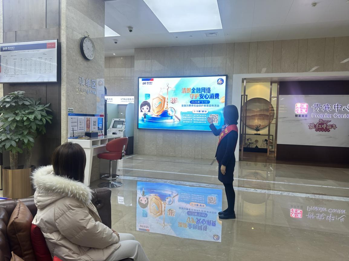 浦发银行青岛分行充分利用厅堂主阵地进行宣传,在公众教育专区醒目位置张贴宣传海报,并摆放宣传折页供客户取阅;利用营业厅内电子智能播放器滚动播放“清朗金融网络 守护安心消费”宣传口号,加强厅堂客户宣导;各网点的“金帆护航”金融消保志愿者们在厅堂为等待办理业务的客户普及金融知识,宣传金融网络营销套路和危害等不法中介乱象。