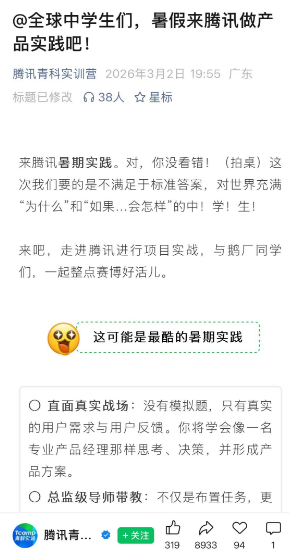 3月2日,腾讯青科实训营发文称,招全球中学生暑假来腾讯做产品经理,年龄限制为13至18岁,引发网友热议。