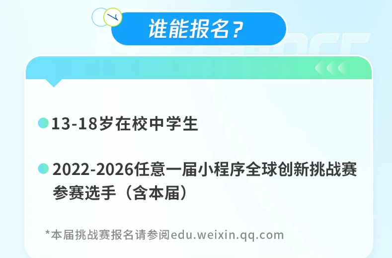 关于报名条件,文中也提到13-18岁在校中学生,2022-2026任意一届小程序全球创新挑战赛参赛选手(含本届) 都可以报名。