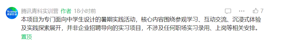 3月3日下午,腾讯青科实训营最新修改该篇文章作为回应,该推文已修改标题,将“@全球中学生们,暑假来腾讯当产品经理吧!”更改为“@全球中学生们,暑假来腾讯做产品实践吧!”,也将原文内容中的“来腾讯‘上班’”改成了“来腾讯暑期实践”,并在评论区补充说明项目性质为暑期实践,并非企业招聘导向的实习项目。