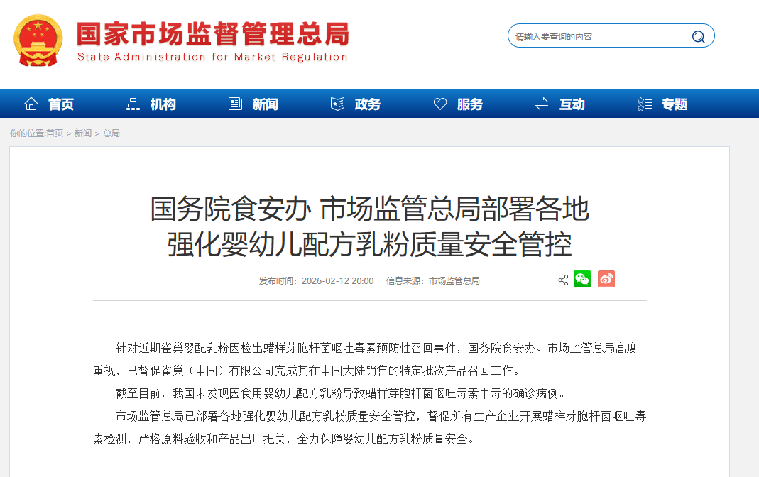 市场监管总局已部署各地强化婴幼儿配方乳粉质量安全管控,督促所有生产企业开展蜡样芽胞杆菌呕吐毒素检测,严格原料验收和产品出厂把关,全力保障婴幼儿配方乳粉质量安全。