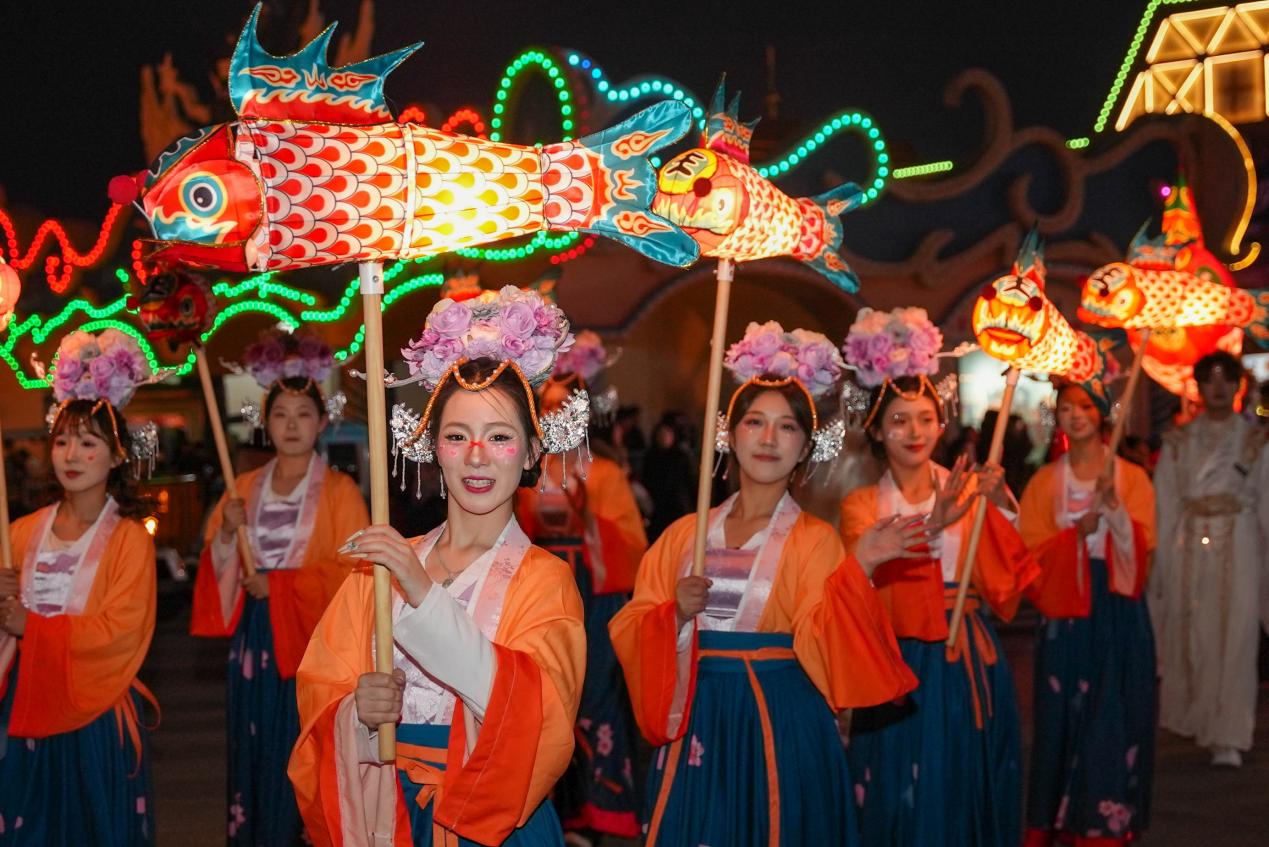 步入华林园,唐宋明三朝风格交织的主题演绎轮番上演,山海经马年花灯流光溢彩,《大河上下》《盛世朝元》等春晚保留剧目加场上演;夜幕降临,新春巡游如流动画卷缓缓铺展,《九曲黄河魂》水影激光秀与璀璨烟花交相辉映,十多个博物馆同步开放,让游客在观演之余,触摸古建筑肌理,聆听奔涌千年的黄河故事。