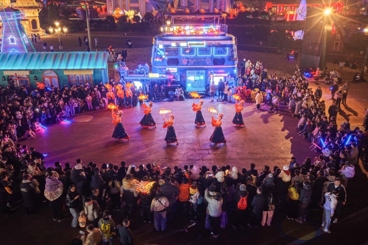 与华林园的典雅古风遥相呼应,欧乐堡梦幻世界则洋溢着童趣与活力。“今年春节,我们对烟花秀进行了全面升级,规模、数量、时长都大幅提升。”欧乐堡梦幻世界营销部部长朱圣楠介绍,节日期间园区推出数百组马年主题花灯及“马上发财”“马到成功”等民俗打卡点;全新引入的鱼灯巡游借鉴安徽传统,与经典花车巡游形成双向互动,十余台花车、百余名演职人员将中国年俗巧妙融入现代游乐场景。打铁花、马战表演、国际马戏等精彩项目悉数登场,全部包含在门票内,真正实现“一票畅玩”。