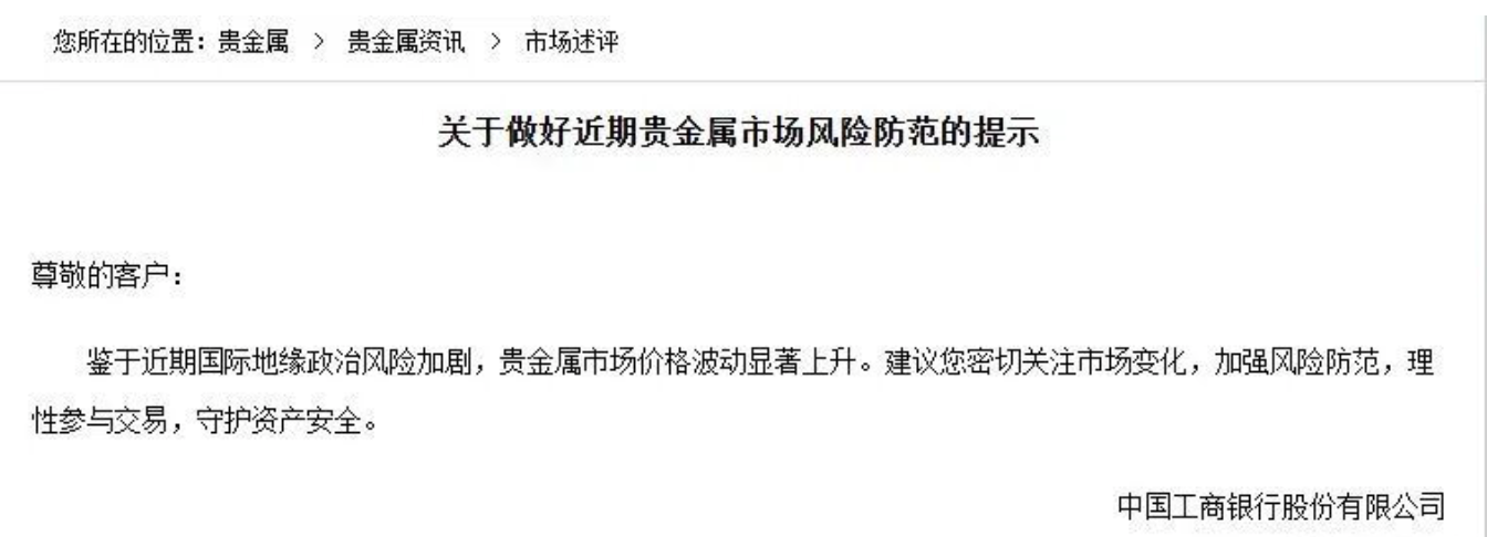 如工商银行3月2日发布《关于做好近期贵金属市场风险防范的提示》。其中称,鉴于近期国际地缘政治风险加剧,贵金属市场价格波动显著上升,建议客户密切关注市场变化,加强风险防范,理性参与交易,守护资产安全。