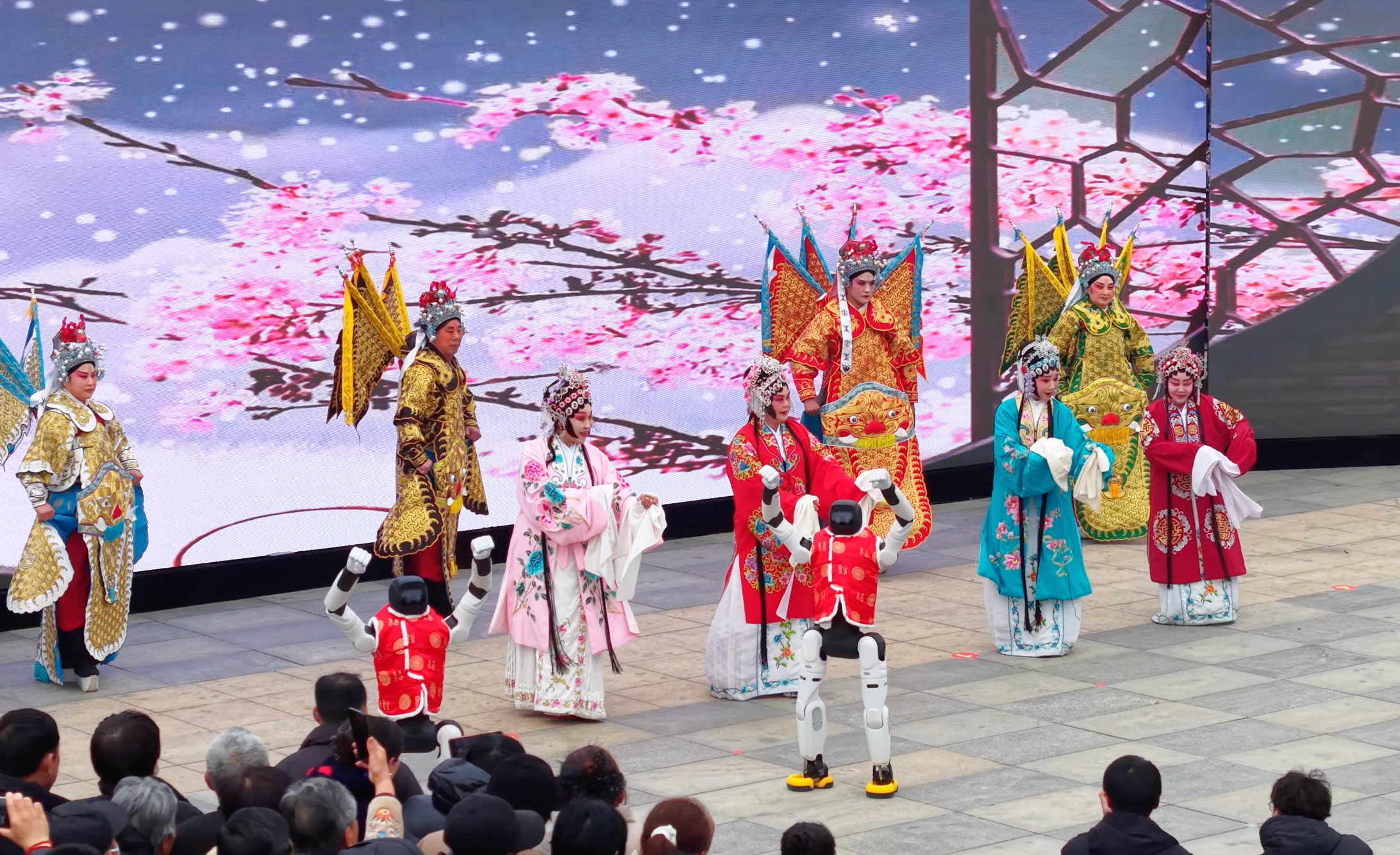 “孩子说想看机器人,没想到在家门口就看到了,还顺便看了演出、尝了小吃,真是热闹又惊喜!”市民刘女士带着孩子,手里还攥着刚买的糖画,满脸笑意。在随后举行的舞台展演中,机器人群舞《大展宏图》动作整齐有力,国家级非遗项目戏歌《无双花》在机器人的配合下更显韵味,将古老艺术注入新的表达方式,赢得阵阵掌声。