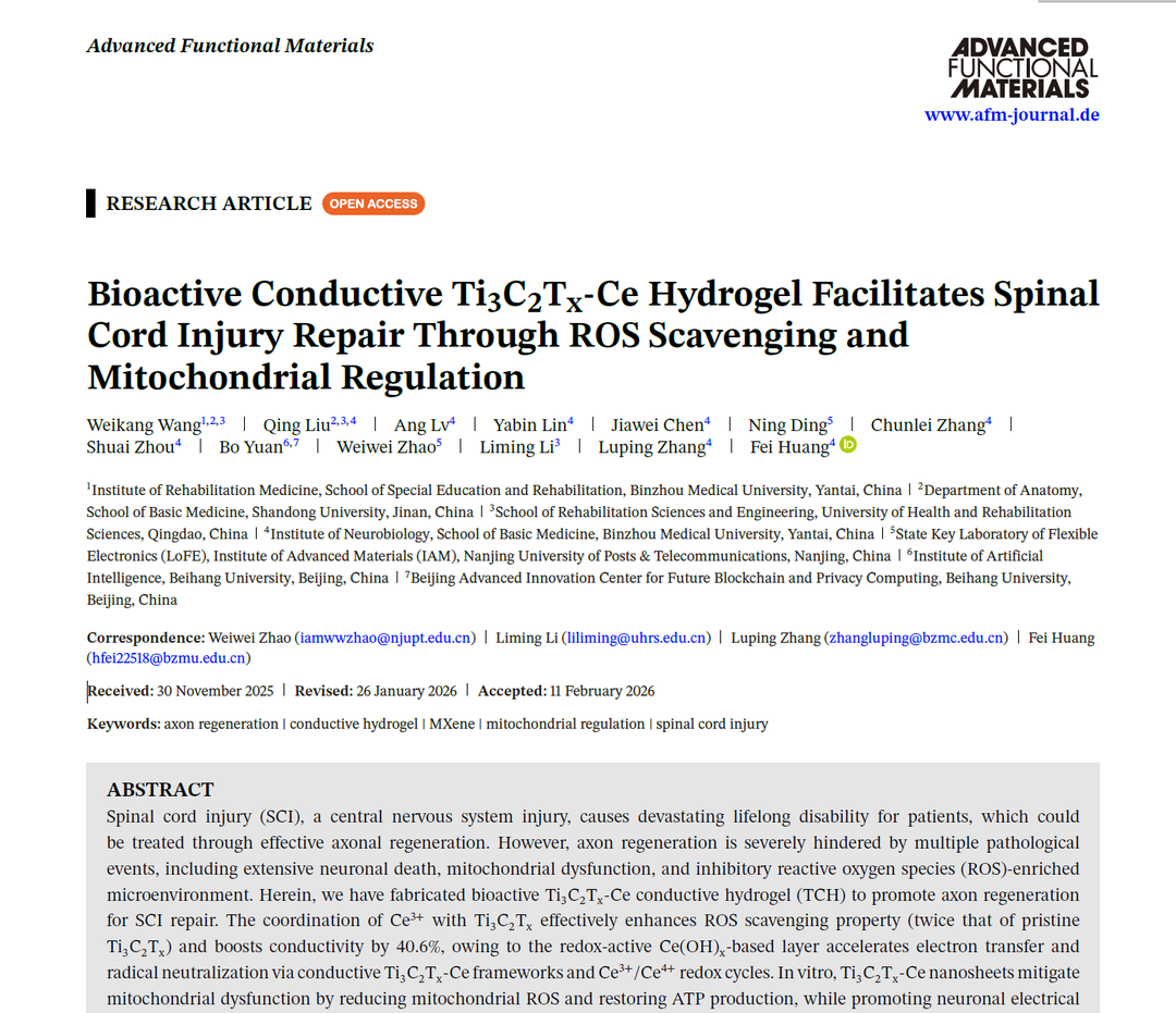 近日,滨州医学院黄飞教授团队最新研究成果被国际顶级期刊《Advanced Functional Materials》(中科院一区,TOP期刊,影响因子19.0)录用。该研究构建了具有抗氧化与线粒体调控功能的生物活性导电水凝胶,为神经再生材料设计提供了新策略。