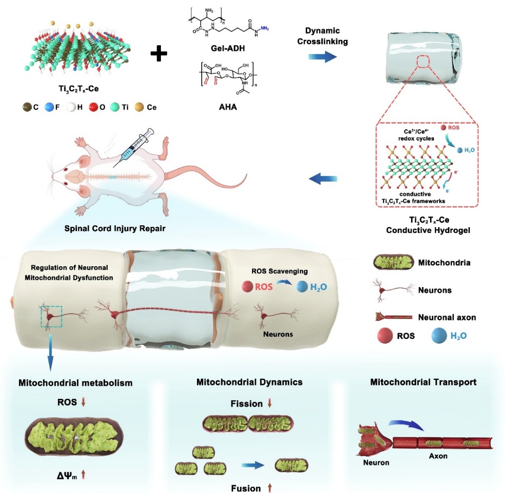 脊髓损伤是一类严重的中枢神经系统创伤性疾病,损伤后持续性氧化应激失衡与线粒体功能障碍显著抑制神经元存活和轴突再生,是制约功能恢复的关键病理因素。围绕这一核心科学问题,研究团队采用铈离子插层策略对Ti3C2Tx纳米片进行界面调控,构建了Ti3C2Tx-Ce导电水凝胶体系。研究发现,Ce³⁺与Ti₃C₂Tₓ表面发生配位作用形成稳定的Ce(OH)ₓ氧化还原活性层,并建立可逆Ce³⁺/Ce⁴⁺循环结构,在增强层间电子迁移与导电稳定性的同时,实现持续高效的活性氧清除。体外实验表明,Ti3C2Tx-Ce纳米片可通过减少线粒体活性氧和恢复ATP生成来缓解线粒体功能障碍,同时促进神经元电活动和活动依赖性Ca2+内流,从而支持电信号传导和能量需求匹配。这归功于氧化还原活性Ce(OH)x层维持细胞内氧化还原稳态和电生理传导性。体内实验表明,TCH显著抑制星形胶质细胞的反应性,并通过调节PI3K/Akt-S6信号通路促进树突结构和神经元轴突的重建。这项工作构建了一种由多功能生物材料介导的功能性神经修复策略,为神经组织工程的材料创新设计提供了新的思路。