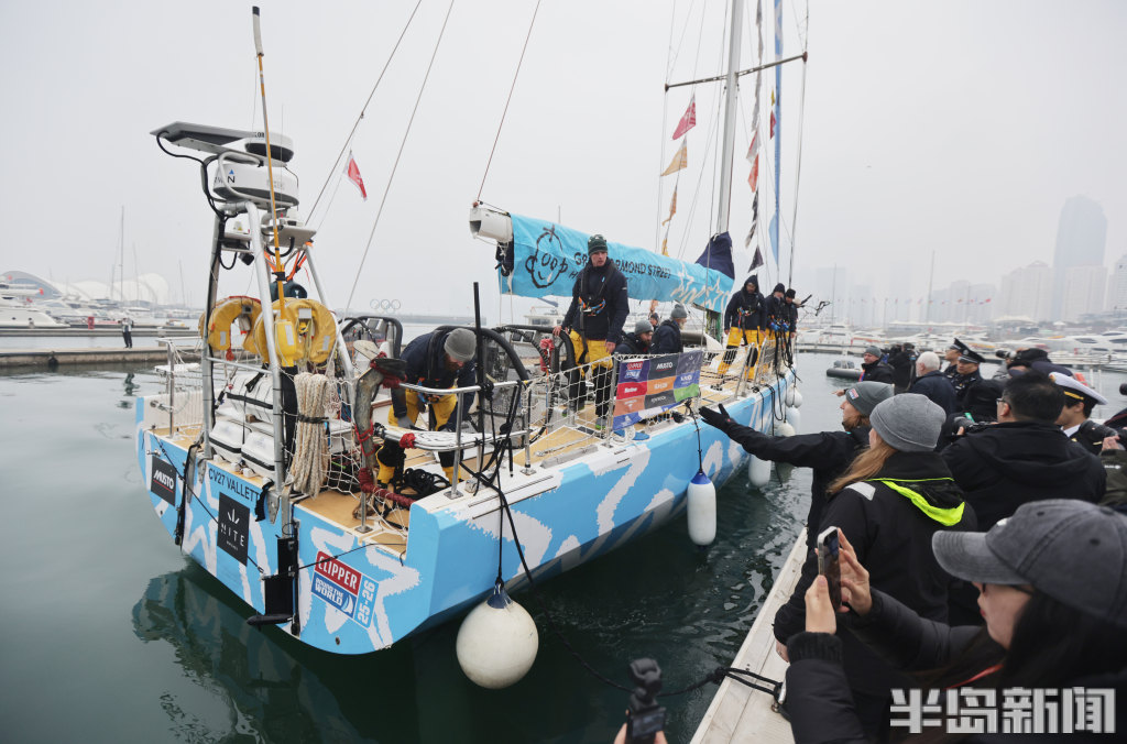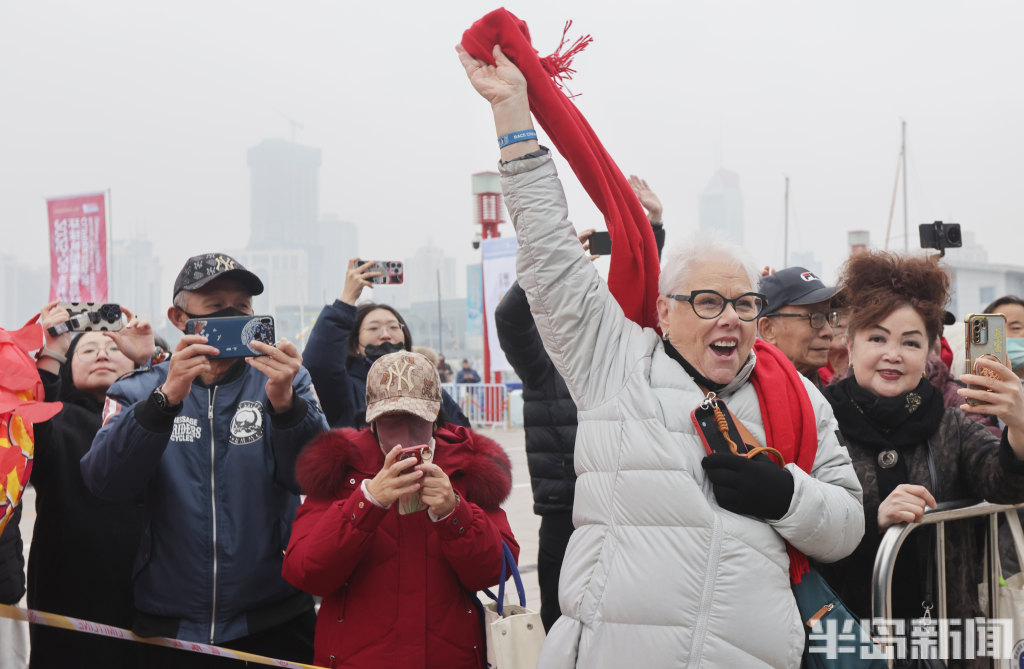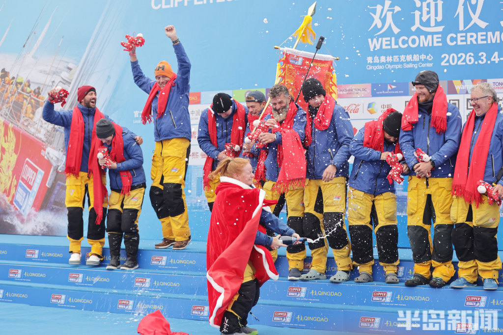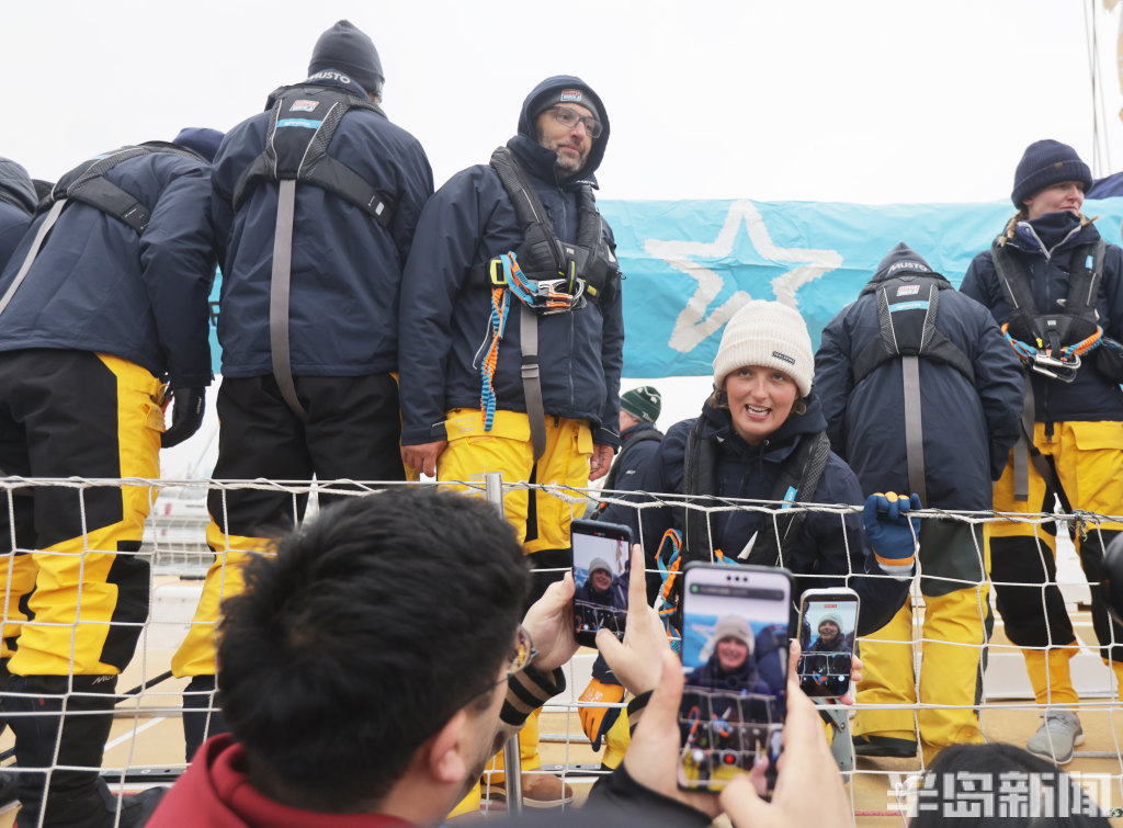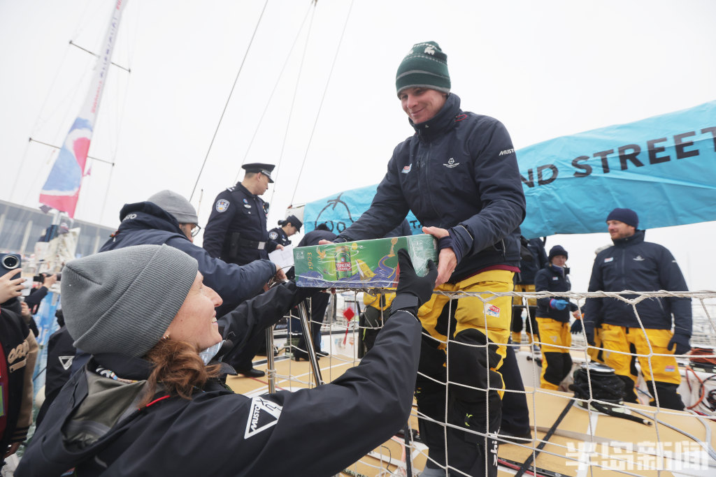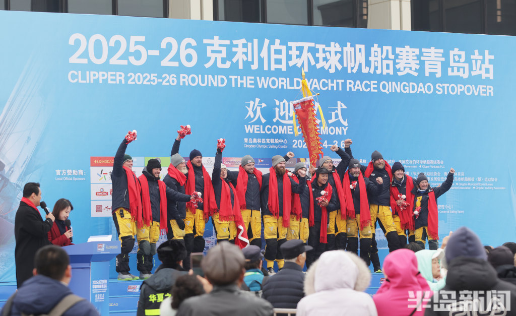 3月4日上午,2025-2026克利伯环球帆船赛青岛站欢迎仪式在青岛奥林匹克帆船中心码头举行,参赛大帆船陆续抵达青岛,船员们下船后很兴奋,品尝了香槟和青岛啤酒,近距离感受到了中国传统的年味,与舞龙、锣鼓队互动。