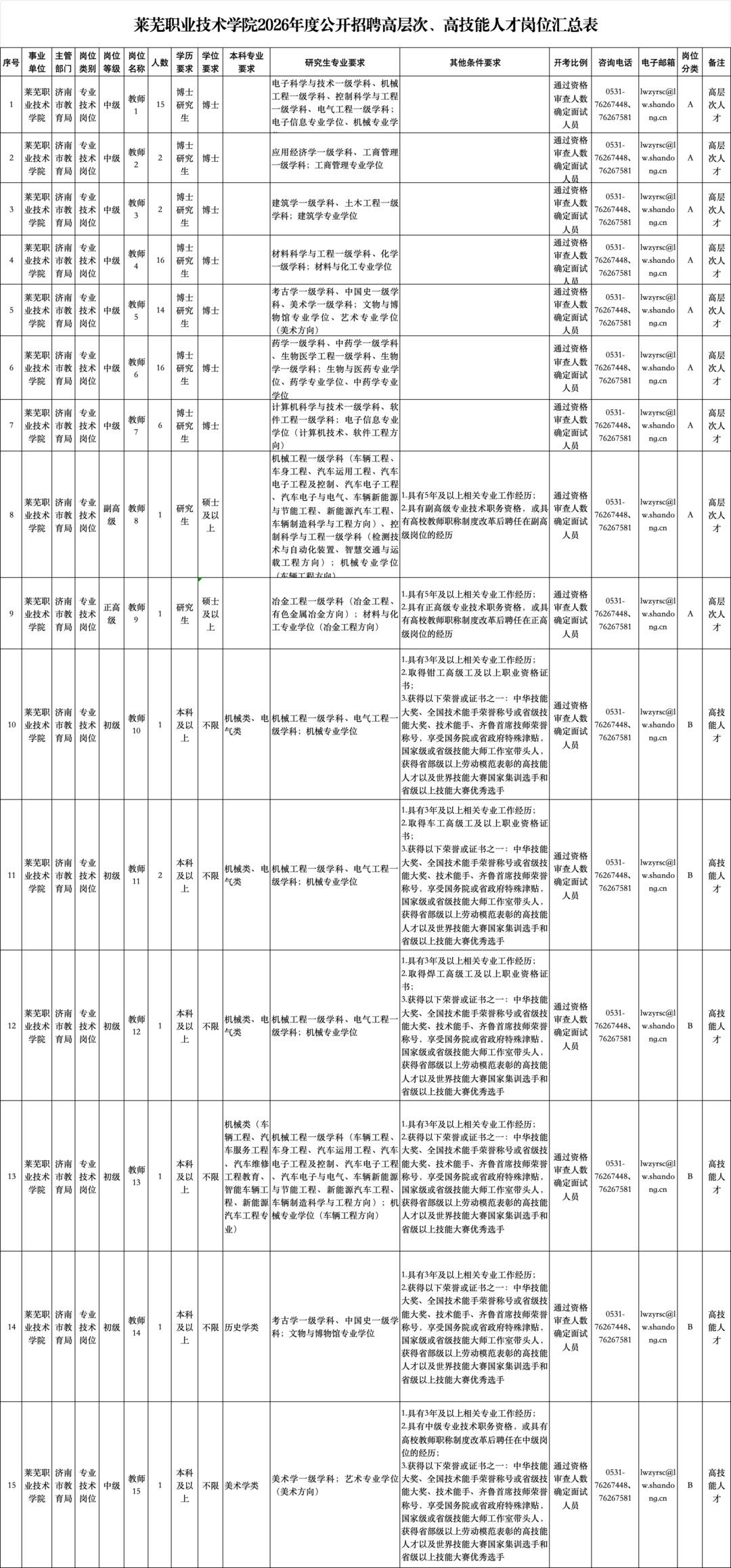 招聘岗位及具体要求详见《莱芜职业技术学院2026年度公开招聘高层次、高技能人才岗位汇总表》(附件1)。