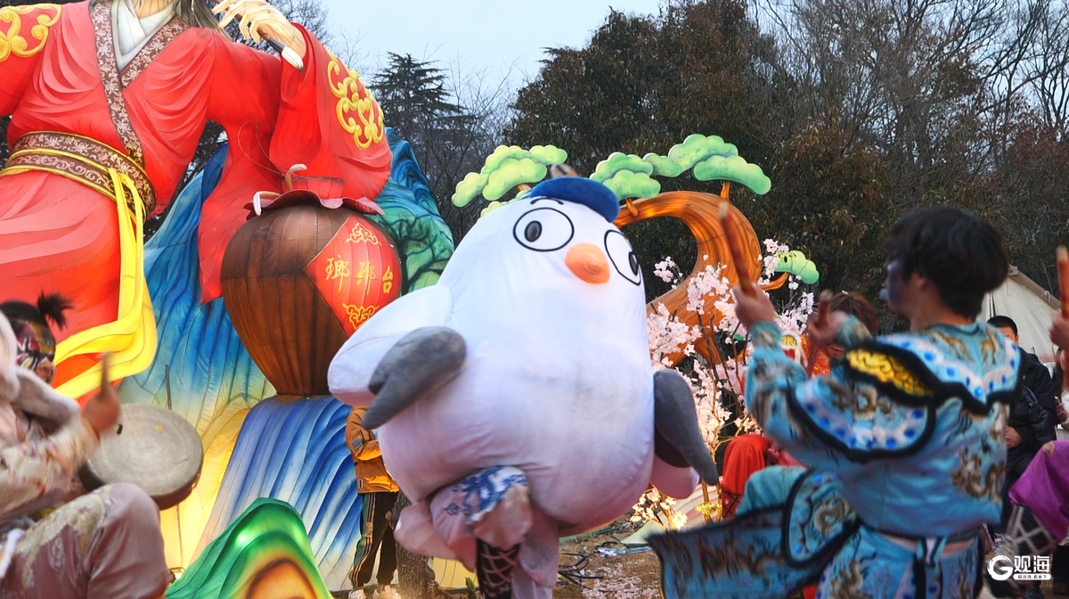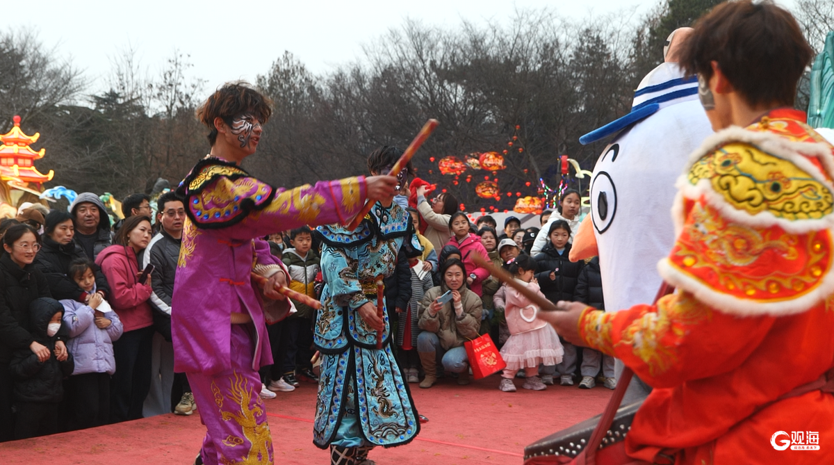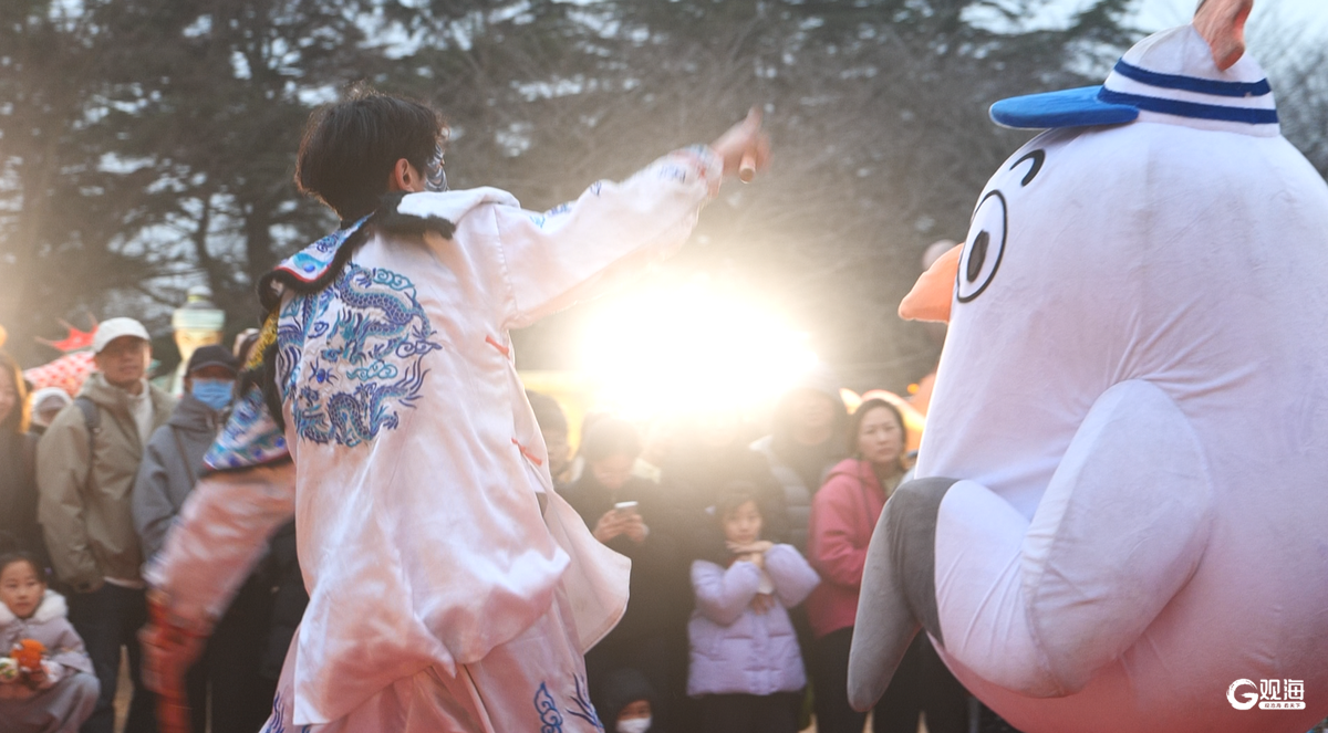 3月3日,青岛海鸥季“鸥啦和它的朋友们”空降巡游活动走进中山公园灯会,与市民游客共庆佳节。活动现场,可爱的海鸥IP形象与英歌舞演员、网红熊猫惊喜联动,共同表演国家级非遗英歌舞,刚劲舞姿与萌趣互动相映成趣。