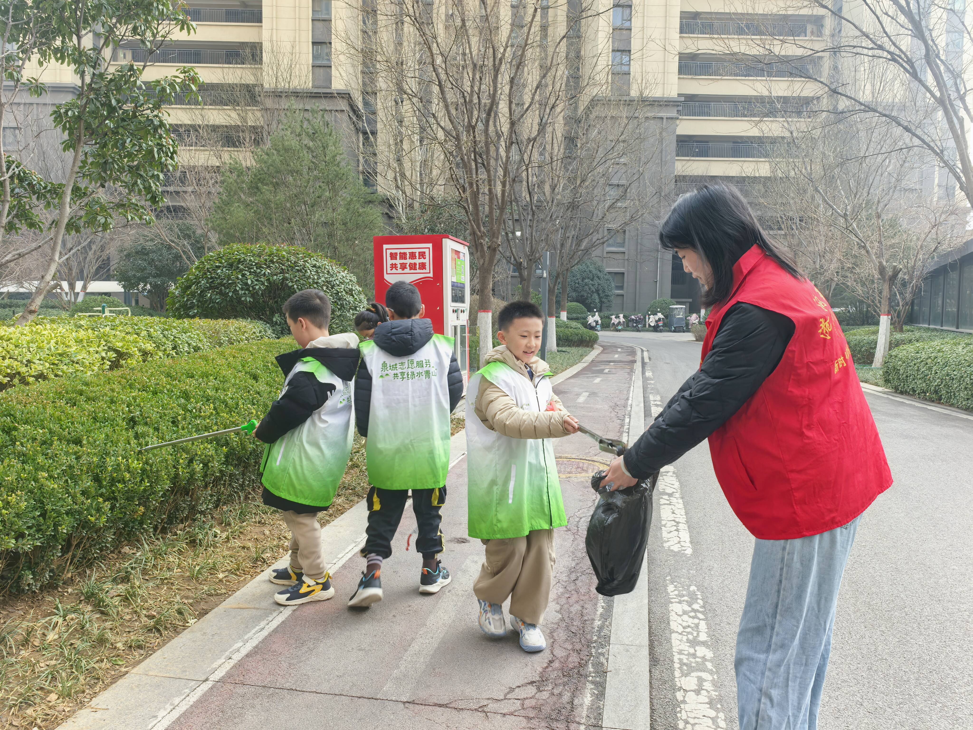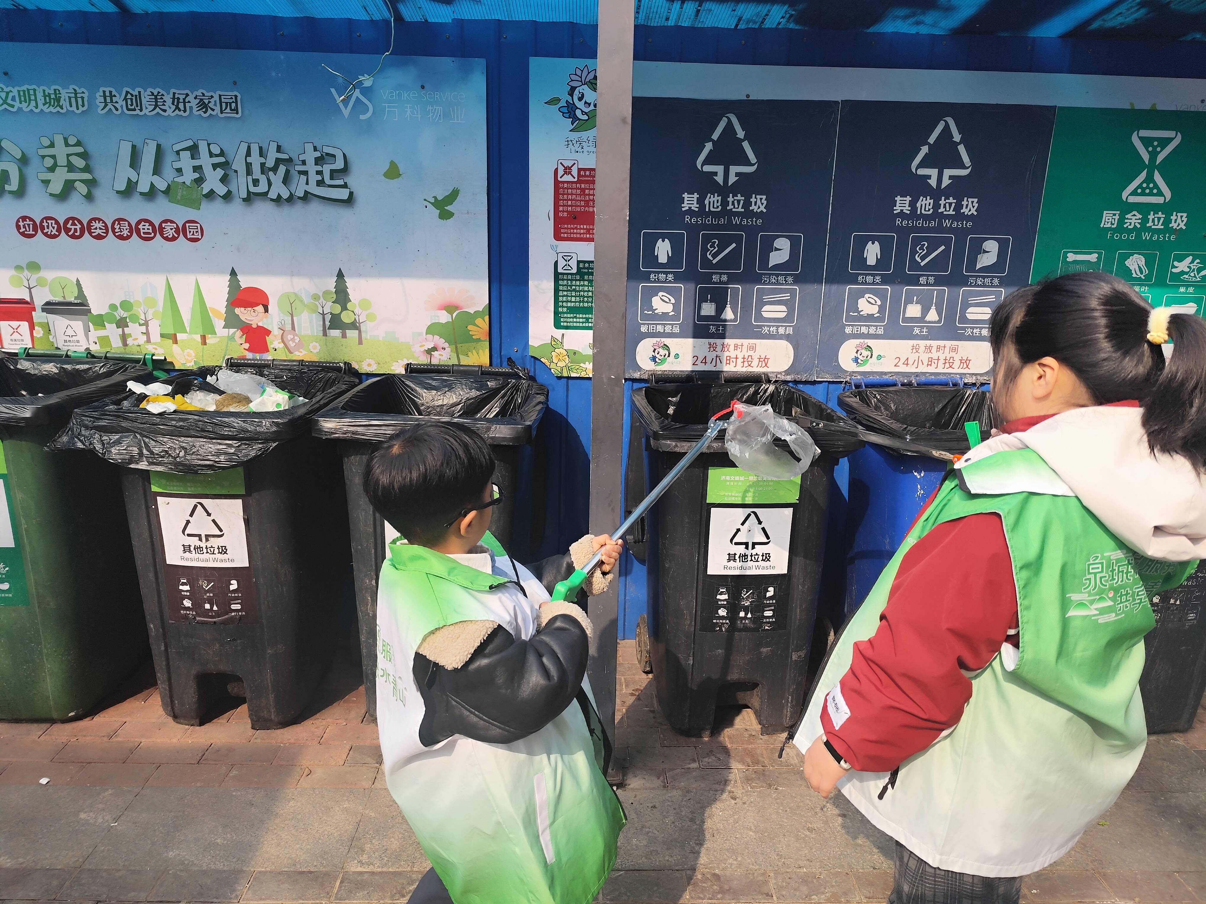 随后,孩子们手持垃圾捡拾器,分组穿梭在小区楼栋间、绿化带旁,仔细排查每一处卫生死角,弯腰捡拾散落的纸屑、塑料瓶、烟头等垃圾。捡到垃圾后,大家认真辨别,分类装入对应垃圾袋,再准确投入分类垃圾桶。