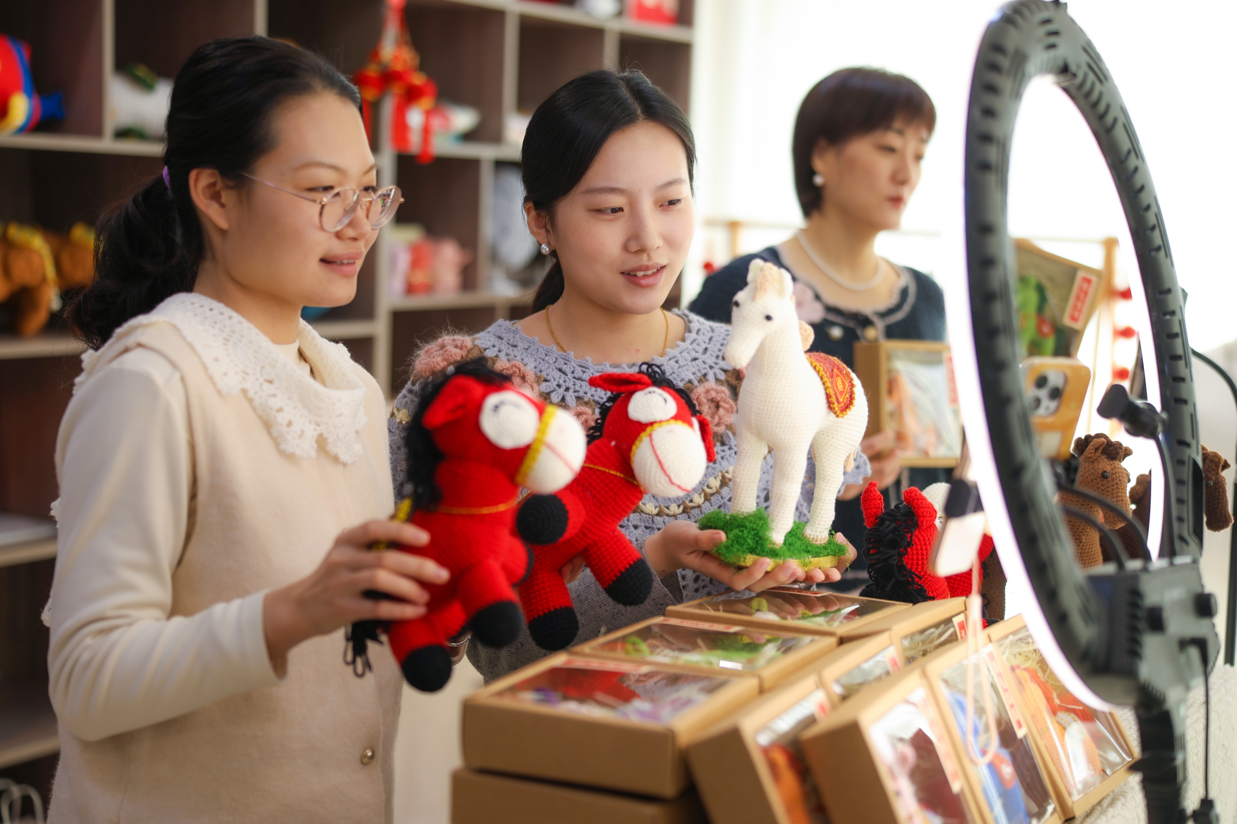 3月4日,在荣成市妇联巾帼创业孵化基地,女性创业者通过电商平台在销售各种钩针编织马摆件。