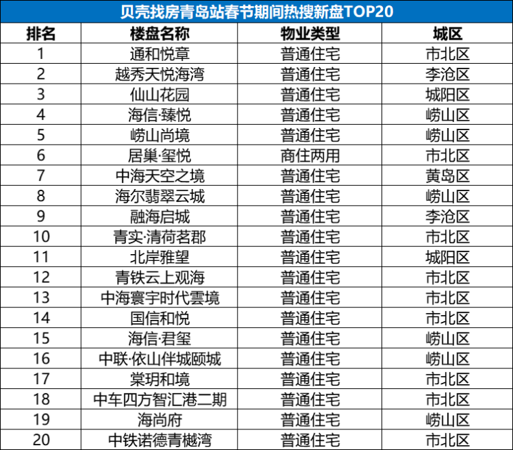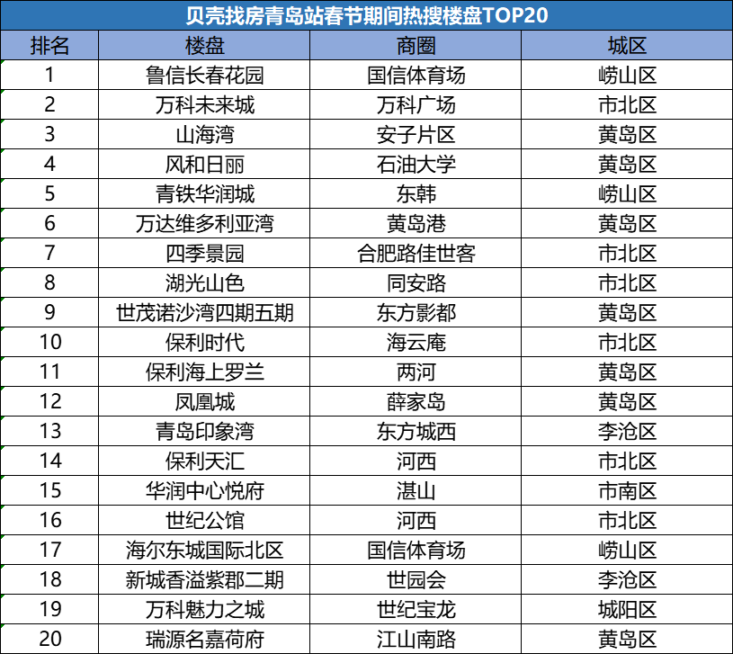 从贝壳青岛站春节热搜TOP20小区及楼盘区域分布来看,市北区及崂山区新房、二手房关注度双高,原黄岛区二手房更受用户喜欢。上榜楼盘以大牌房企、成熟社区以及次新口碑盘为主,表明当下青岛楼市优质次新房与核心区改善盘更受购房者青睐。