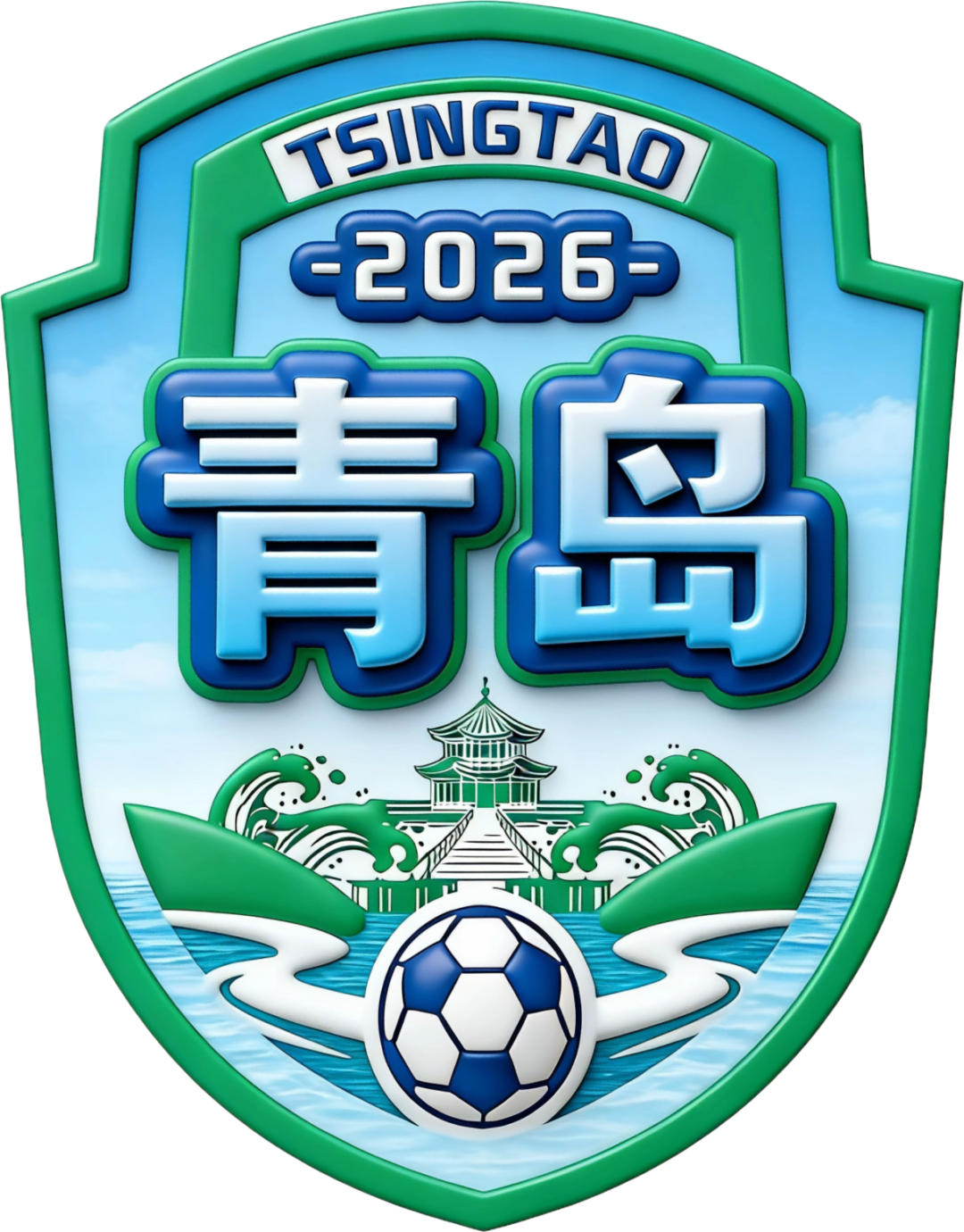 文字标识上,顶部“TSINGTAO”,是青岛城市历史与国际辨识度的独特符号;中间“2026”字样标注了球队参赛时间,既是对新征程的铭记,也承载着全新赛季的期待与目标;核心的“青岛”二字采用立体浮雕设计,厚重醒目,直接点明城市归属,强化“为青岛而战”的身份认同。