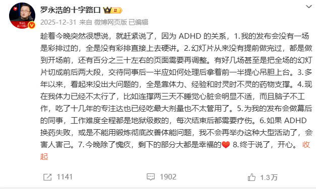 此前,罗永浩在2025年12月30日的科技创新分享大会上迟到40多分钟,次日凌晨通过自曝长期受ADHD(注意缺陷多动障碍)困扰,引发公众关注,罗永浩在现场鞠躬道歉。次日凌晨,罗永浩在微博发文回应“科技春晚”迟到40分钟的原因:因为ADHD(注意缺陷与多动障碍)的关系,发布会没有一场是彩排过的,全是没有彩排直接上去硬讲。