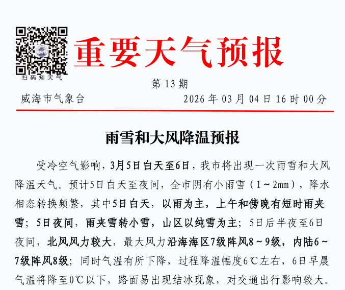 3月4日下午,威海市气象台发布雨雪和大风降温预报: