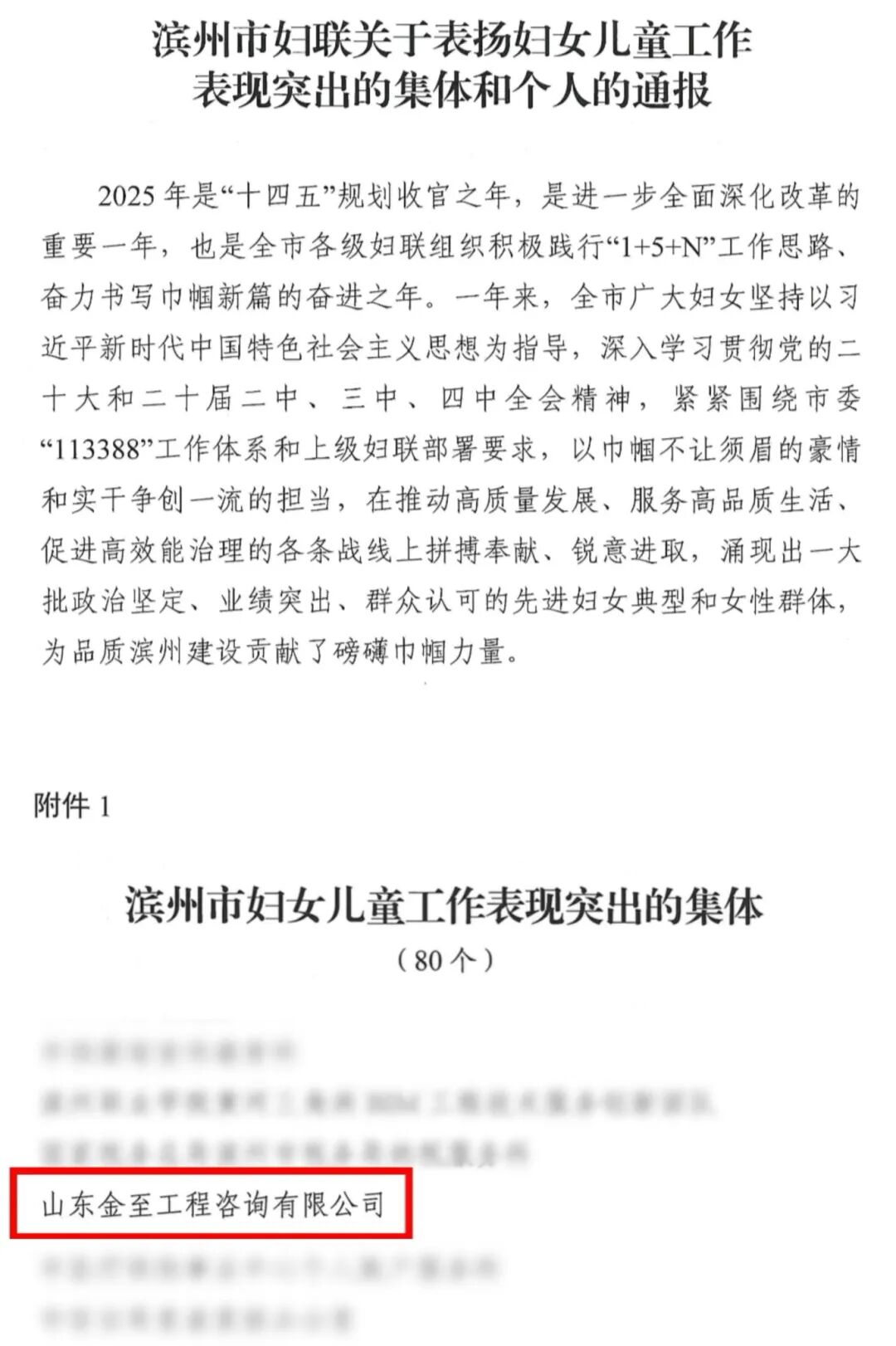近日,滨州市妇女联合会发布了《滨妇发〔2026〕9号滨州市妇联关于表扬妇女儿童工作表现突出的集体和个人的通报》,表彰2025年度全市妇女儿童工作表现突出的集体和个人,市公用事业集团权属金至咨询公司荣获“滨州市妇女儿童工作表现突出的集体”称号!