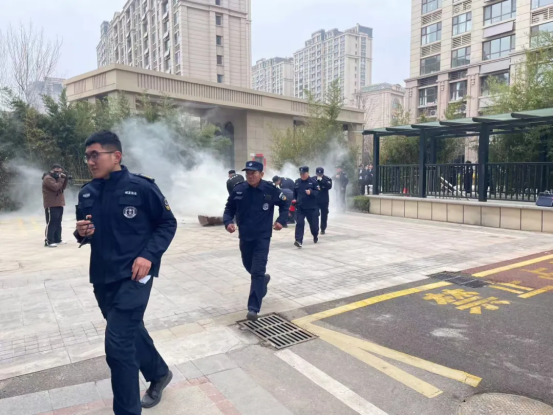 会议结束后,开展了现场观摩和消防演练活动。消防演练现场释放烟雾模拟火灾场景,物业“消防站队员”迅速有效控制火情,小区工作人员组织居民快速疏散,演练过程紧张有序、处置规范,有效检验了物业队伍的应急响应能力和协同作战水平。