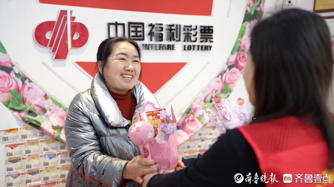 上午,片区管理员王煜走进37140120号销售网点。她将一捧插着即开票的花束和一个艾草按摩锤递到女销售员吴新辉手中,笑着说:“大姐,这段时间辛苦啦!这束花是咱福彩的一点心意,专门送给您这样的‘她力量’。您天天在这儿为大家服务,把公益的温暖传递出去,也愿您自己每天都跟花似的,开开心心、漂漂亮亮!”吴新辉接过花束,眼角漾开笑意:“哎哟,真没想到能收到这么用心的祝福,太谢谢了!”