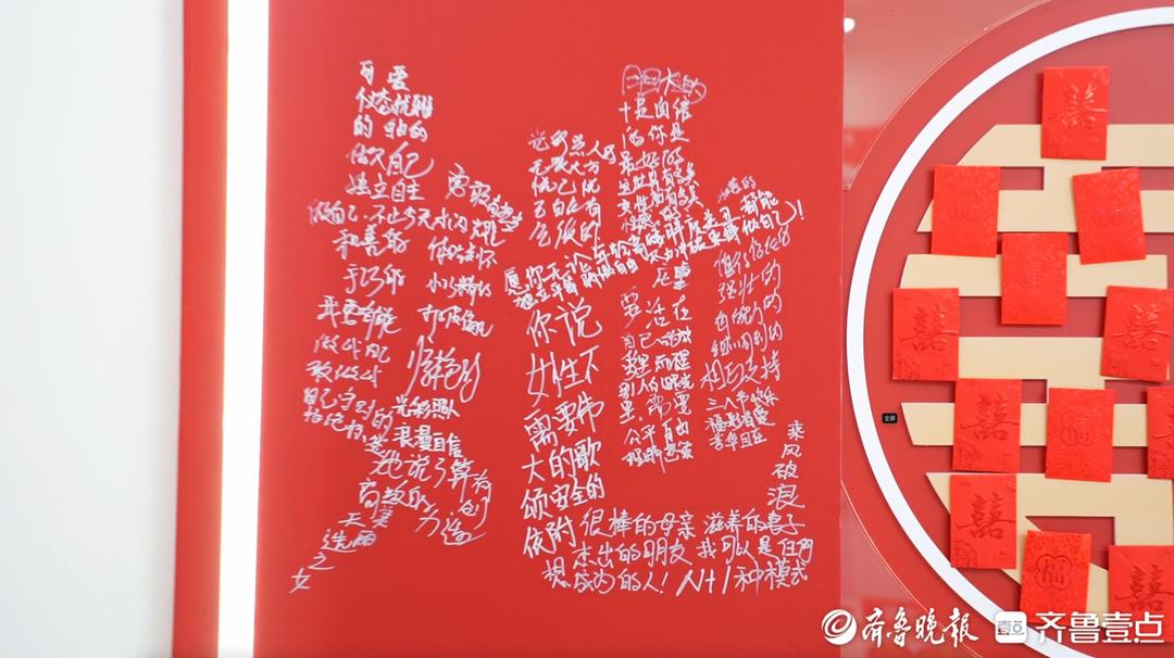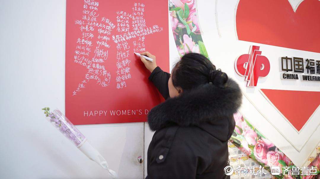 此时彩友刘女士正在选购彩票,王红霞抽出一支粉百合送到她手中:“姐,节日快乐!有什么心愿,可以写在那边的心愿墙上。”刘女士笑着走到“她”字墙前,提笔在空隙间添上一句:“愿父母健康,子女学业有成。”她退后一步细看,那个大大的“她”字,已经被密密麻麻的心愿填满——“希望女儿考研成功”“愿父母双亲安享晚年”“盼天下无孤老”“愿孩童皆欢颜”……每一个笔画里,都藏着一位女性最朴素的期盼;每一个空隙间,都流淌着一份最真挚的祝福。