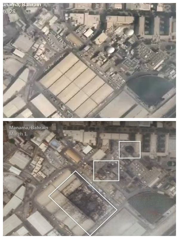 位于巴林的美军第五舰队总部遭袭前后对比图。