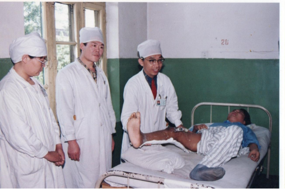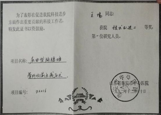 初到泰安市中心医院,也就是那时的泰安地区医院时,各方面的条件还比较简陋,当时医院东大门前的道路,即现在的龙潭路还坑洼不平,是条流水沟,医院四周没有院墙,周边都是少量的玉米地,更多是荒地。医院临床科室仅设大外科、大内科、妇产科、五官科等基础科室,设备方面,一台只能做胸部透视和拍片的X光机已经算是先进设备。王阳所在的骨科,连纱布、碘酒等基础医疗物资也时常匮乏,各类手术器械都需反复消毒使用。面对艰苦的条件,王阳没有退缩,而是以身作则带领科室发展,他带头早到岗、细查房,要求科室医生严于律己,坚持住院大夫24小时负责制,24小时内完成病历书写。面对脊柱内固定等难题,王阳创造性地用钢丝内固定装置,加植骨融合术,成功治愈多例腰椎峡部崩裂和腰椎滑脱以及外伤性腰椎骨折后并不全截瘫的患者,相关技术还在青岛、广州、香港等地进行学术交流推广。这一“土法创新”既是当时艰苦的条件所迫,也体现了老一辈医者的智慧与担当。
