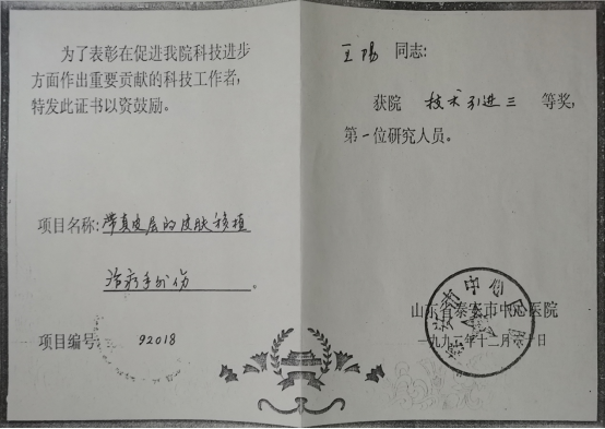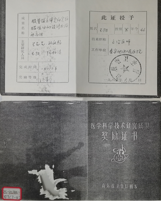 从1976年走来,王阳从未放弃对医学的探索,从外科副主任到骨科主任再到泰山医学院第一教学医院外科教研室副主任,他不断学习和创新,医学技术炉火纯青,对骨病、创伤、结核、骨肿瘤、脊柱外科及人工关节置换等都非常擅长。在他的带领下,医院骨科从最初与泌尿外科、神经外科共用不到40张床位,逐步发展细分出了创伤骨科、脊柱外科等多个专业,他参与研制的“股骨颈瞄准器的设计及临床应用”获得山东省及泰安市科技成果三等奖,另有8项新技术获医院奖励,填补了医院骨科多项空白。