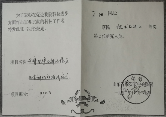 1982年王阳获省卫生厅医学科技技术研究成果二等奖