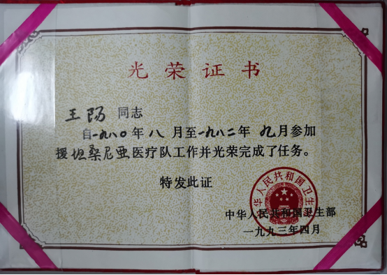 1993年王阳获国家卫生部颁发的援坦桑尼亚医疗队光荣证书