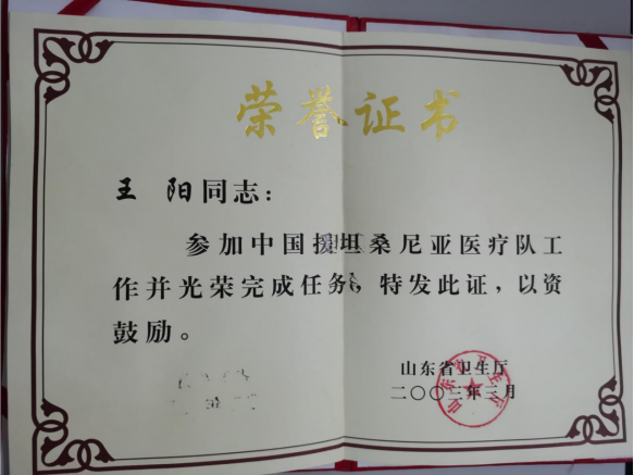 2003年山东省卫生厅为王阳颁发援坦医疗队工作荣誉证书