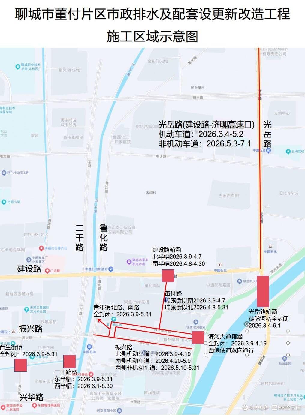 3月9日起,聊城振兴路、董付路、青年渠部分路段封闭施工