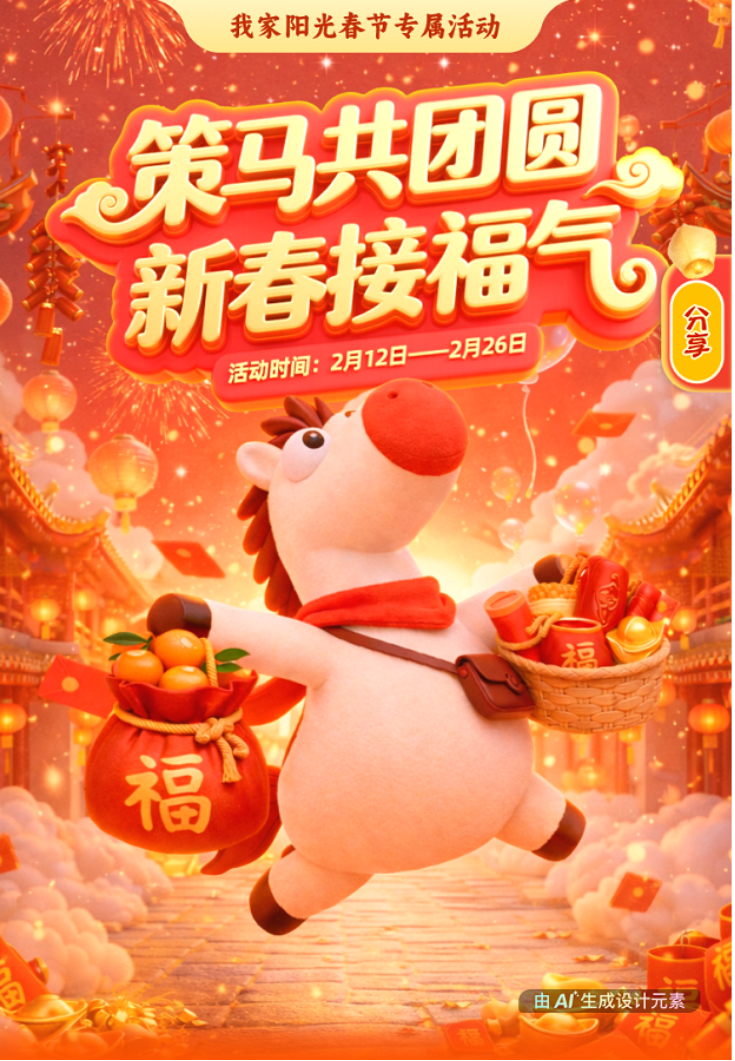 在“我家阳光”APP平台,阳光人寿打造了“策马共团圆 新春接福气”客户线上专属活动,通过四大板块,让客户足不出户即可参与新春互动。