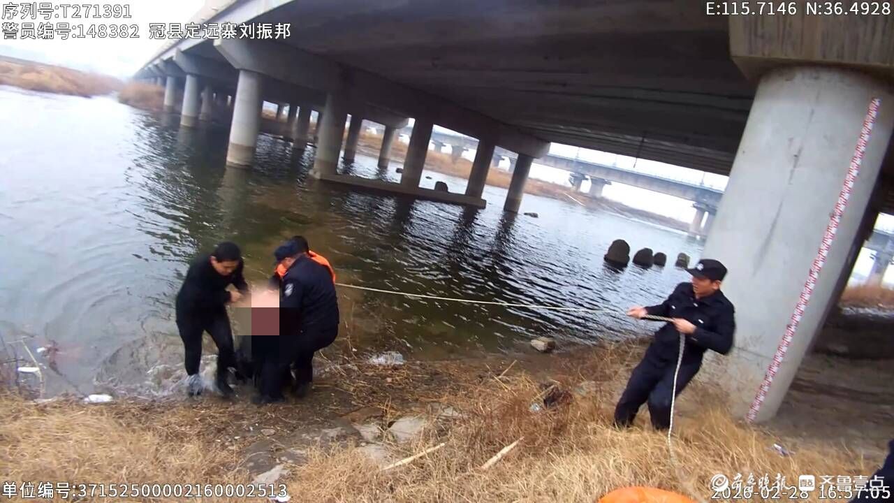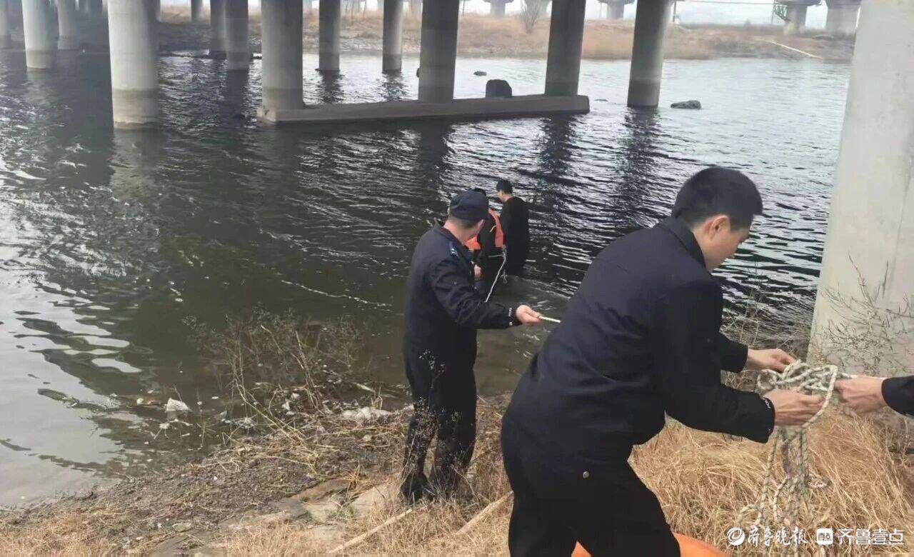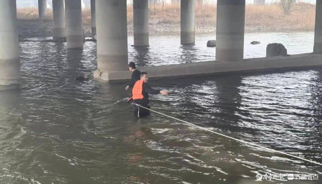 “来不及了,我下水!”话音刚落,民警刘振邦、辅警杨立明边跑边甩掉外套,迅速穿好救生衣、系紧救援绳,纵身跃入刺骨的河水中。