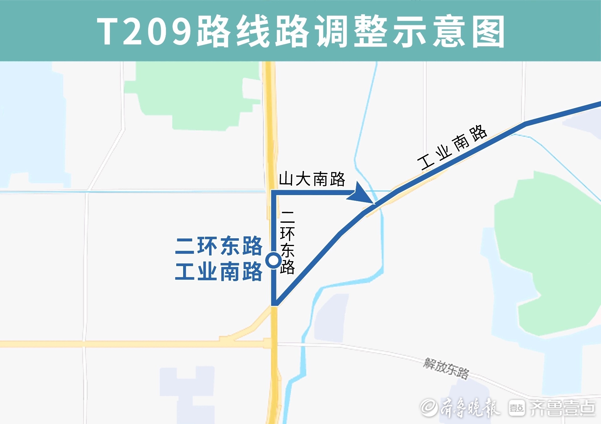 T209路由唐冶公交枢纽开往二环东路工业南路,优化调整后沿工业南路向西、二环东路向北、山大南路向东至工业南路向东恢复原线,沿途增设地铁山大南路东口站站点。